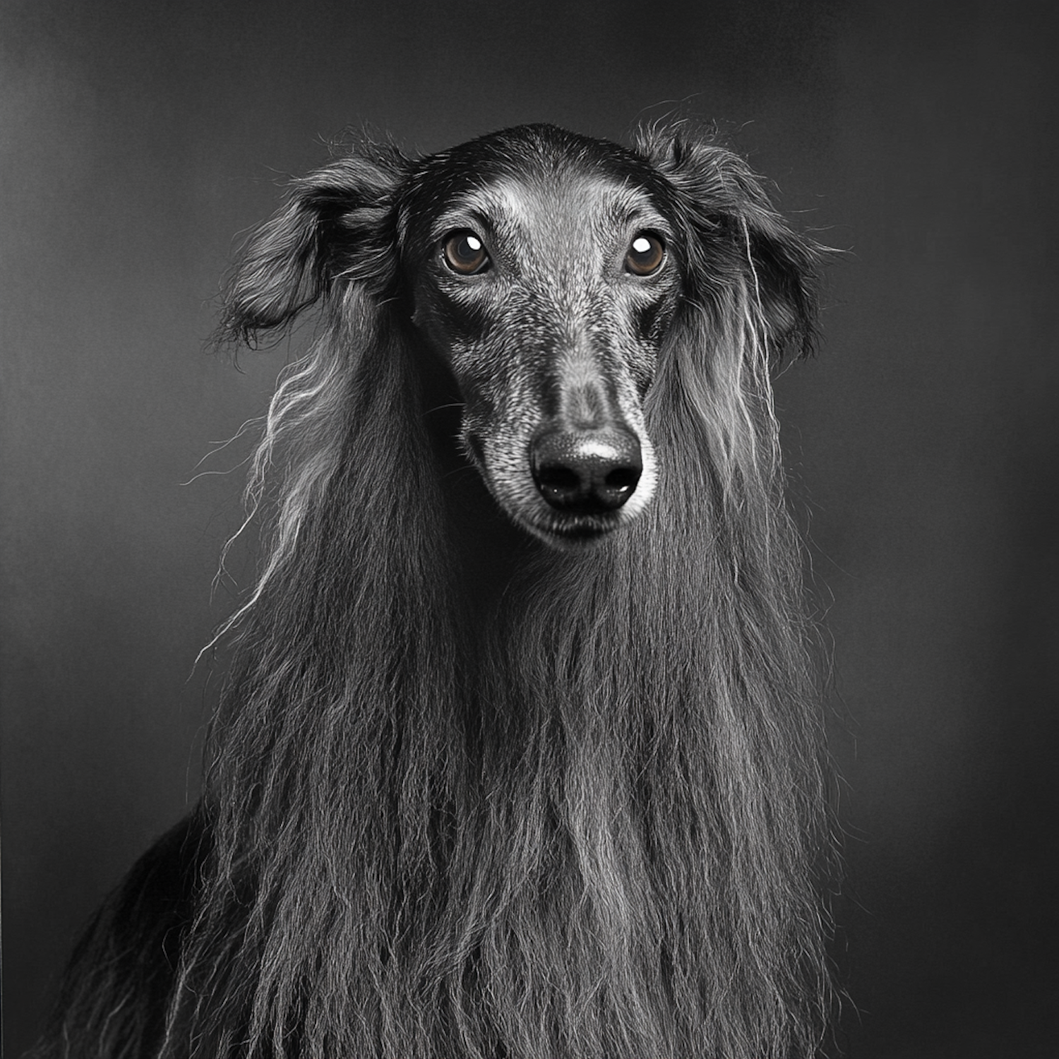Elegant black and white portrait of a long-haired dog with expressive eyes and silky fur, set against a dark gray background.