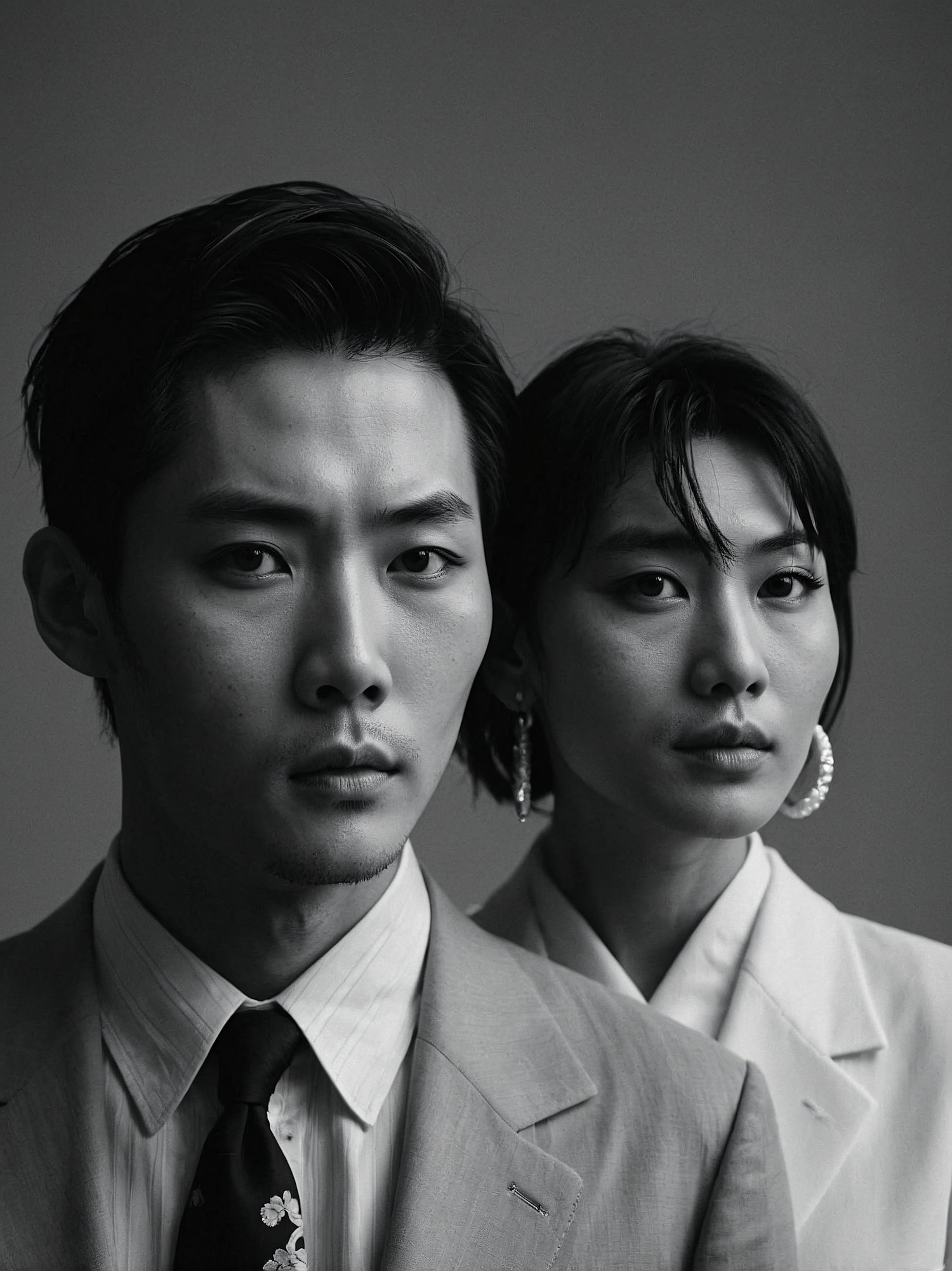 Elegant black and white portrait of an Asian man and woman in formal attire, showcasing a timeless and sophisticated style.