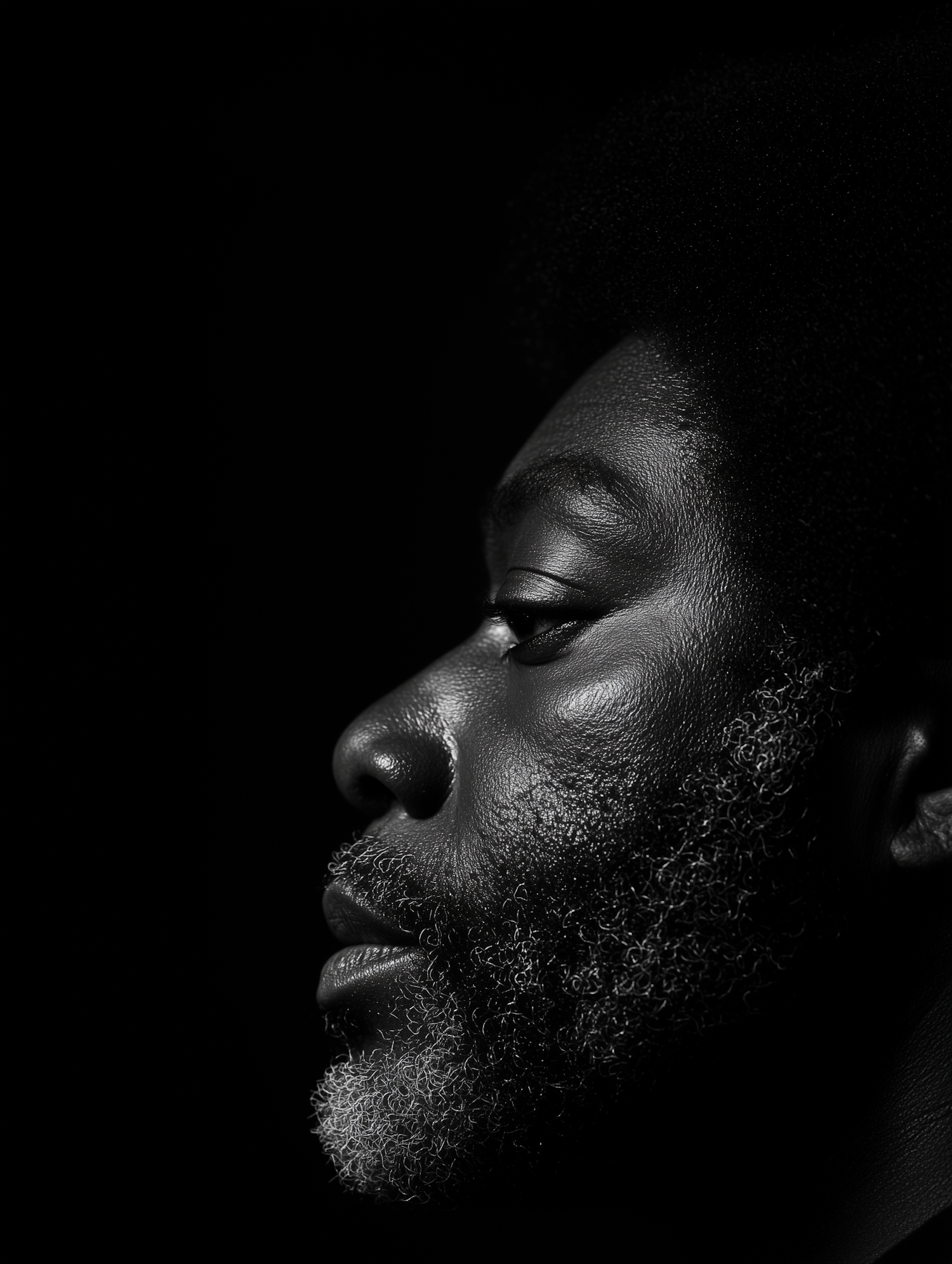 Black and white profile portrait of a Black man with an afro and beard, highlighting facial texture and expression.