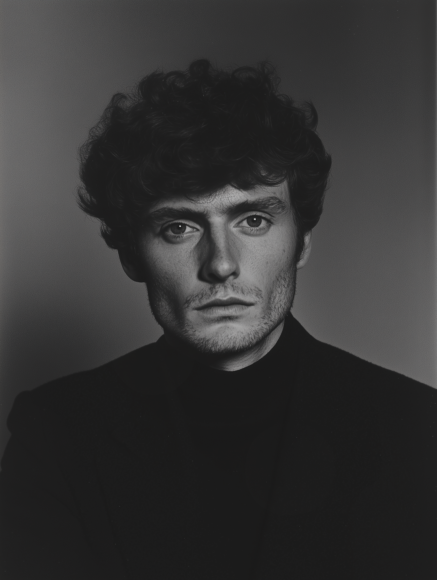 Black and white portrait of a man with curly hair and intense gaze, wearing a turtleneck and jacket.