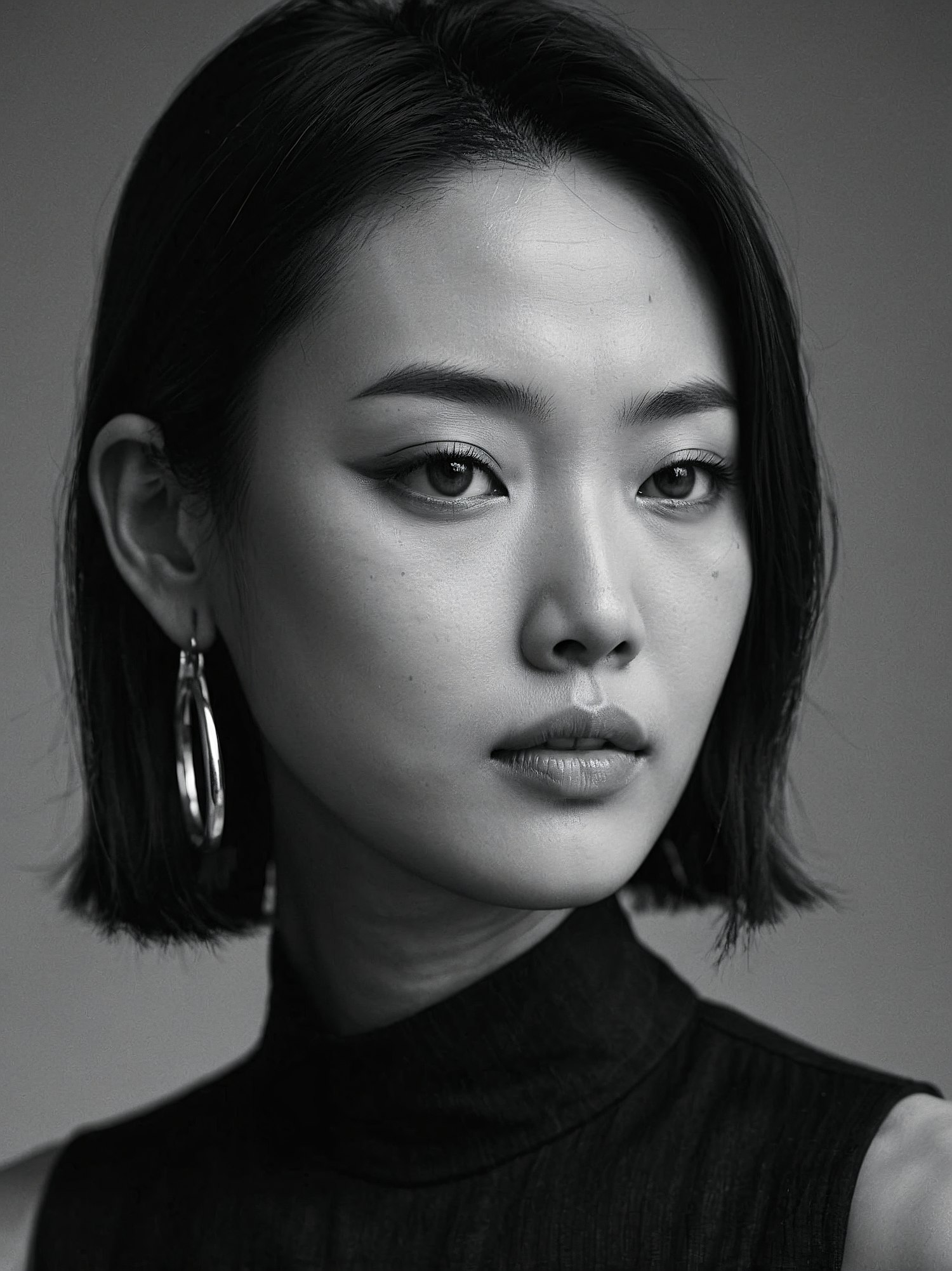 Black and white portrait of an Asian woman with a bob haircut, wearing a hoop earring and a high-neck top, exuding elegance.