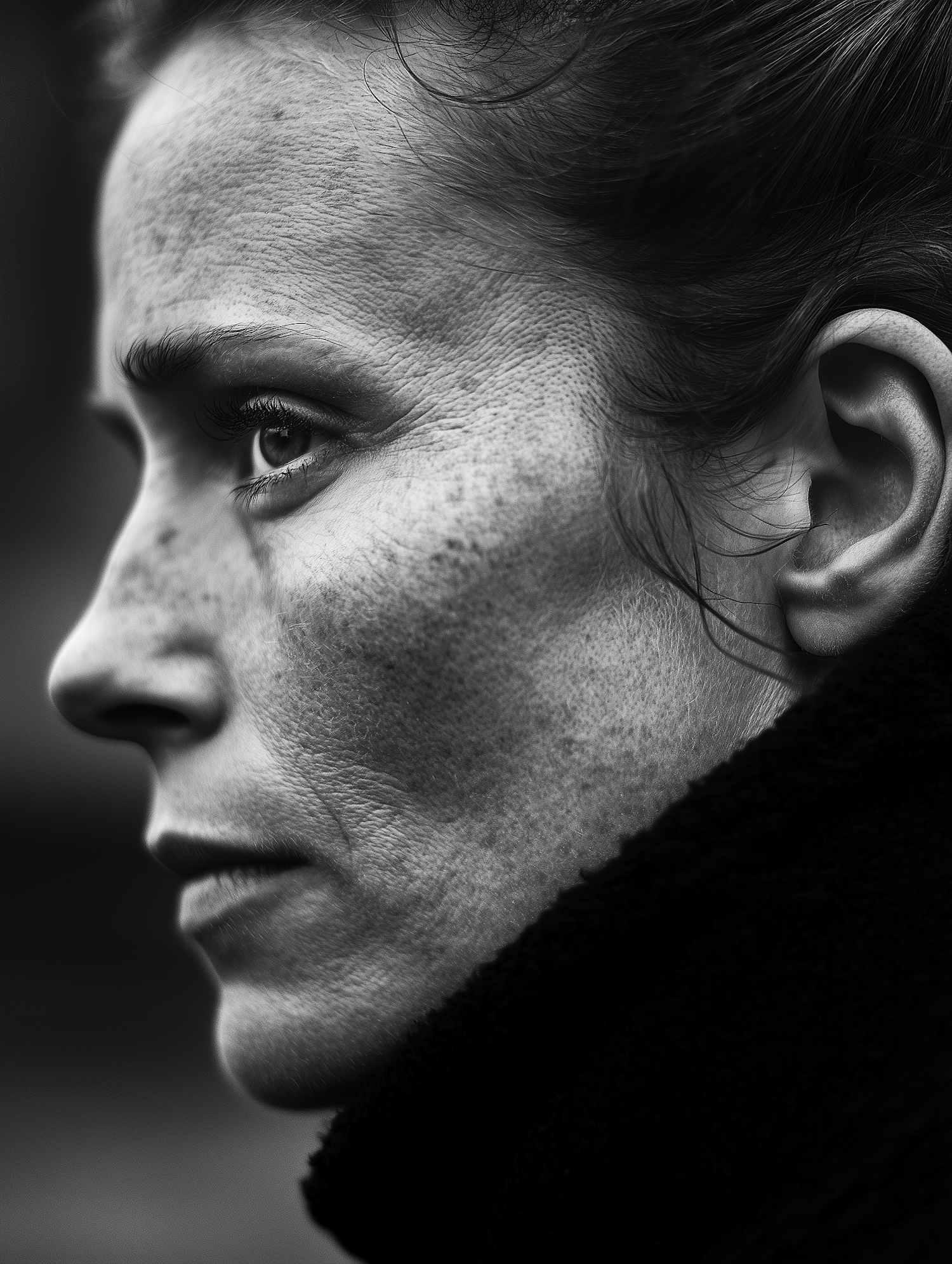 Black and white close-up portrait of a woman in profile, highlighting skin texture and contemplative expression.