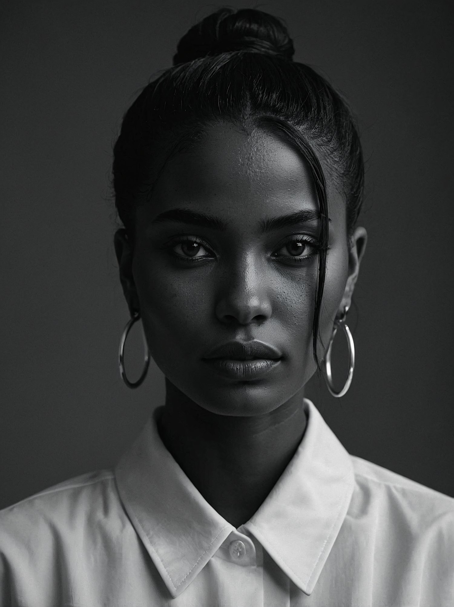 Black and white portrait of a woman with hoop earrings and a bun, wearing a white shirt. Striking and elegant composition.