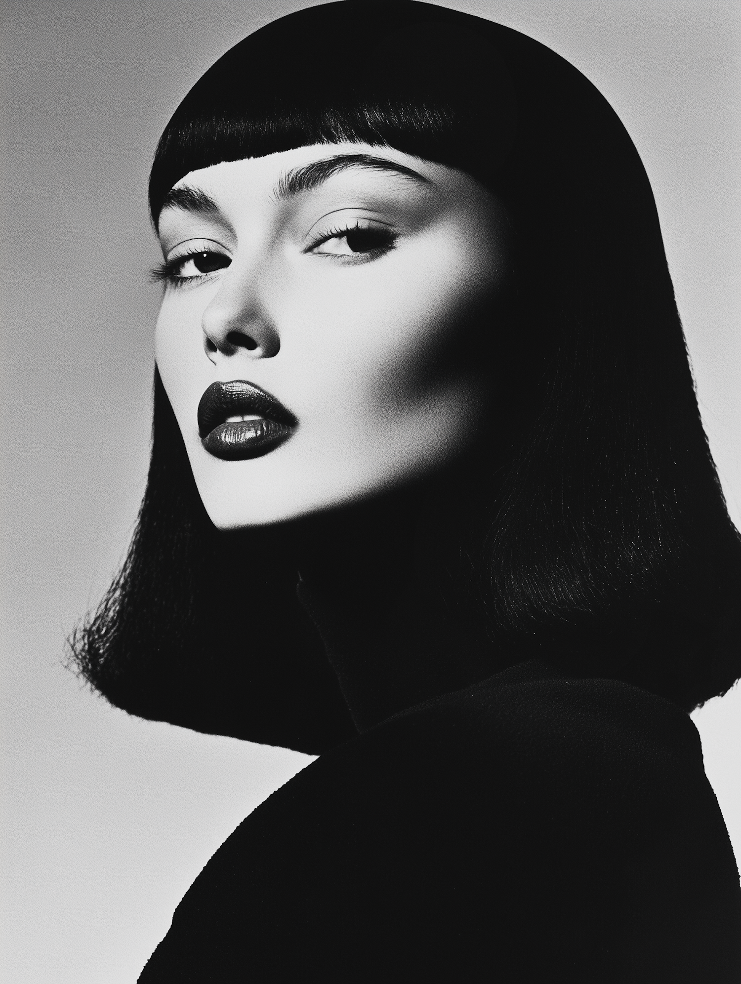 Black and white portrait of a woman with sleek bob and bold makeup, exuding confidence and elegance.