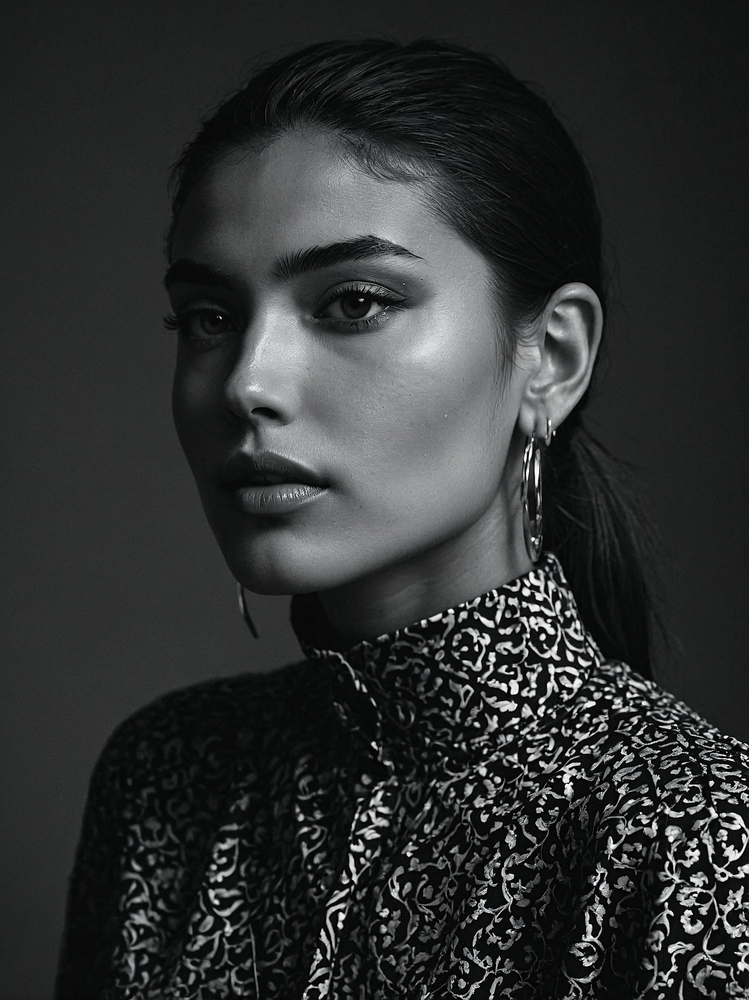 Black and white portrait of a woman with hoop earrings and a patterned blouse, exuding elegance and confidence.