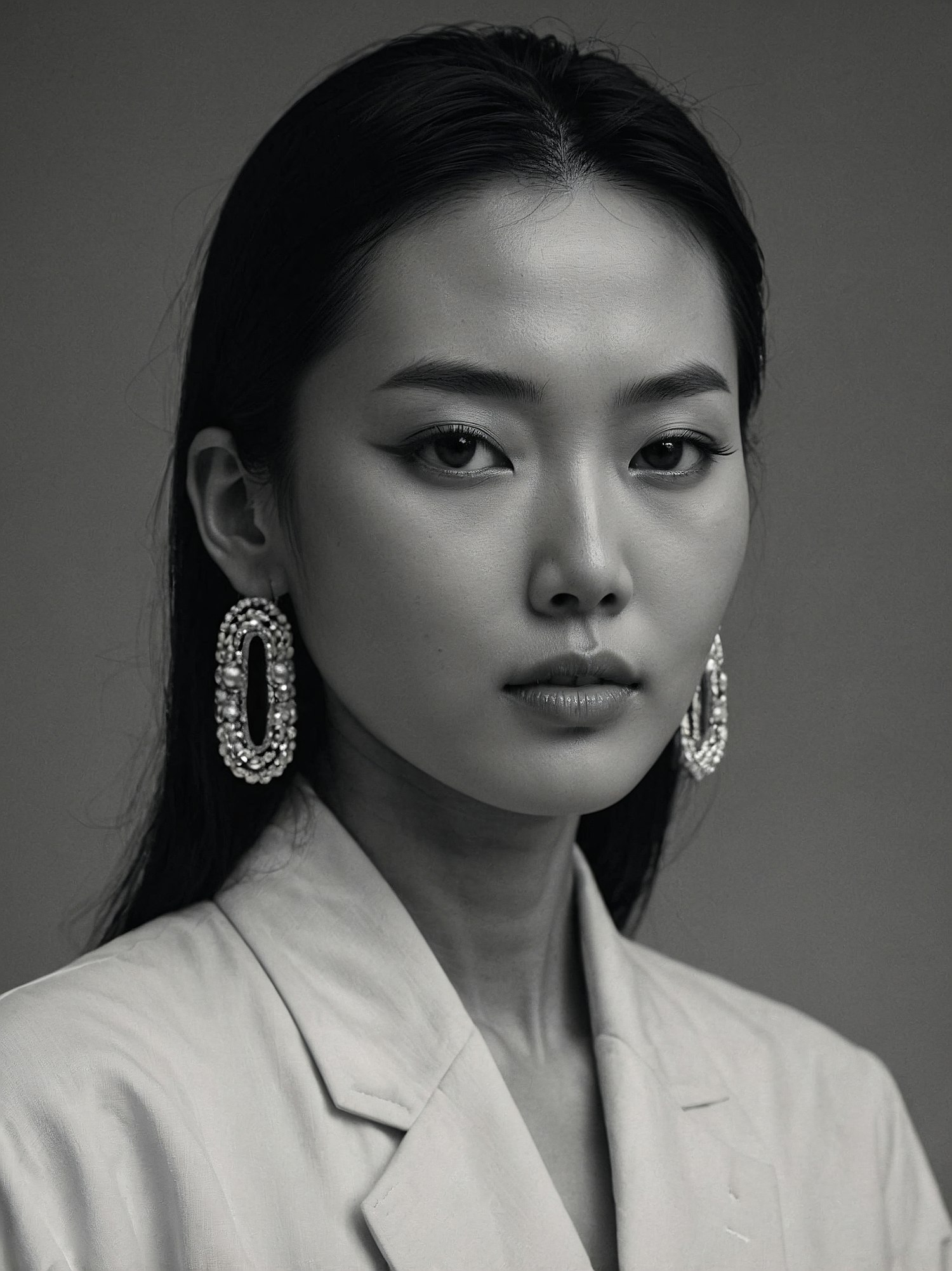 Elegant black-and-white portrait of an Asian woman with statement earrings, minimal makeup, and a sophisticated blazer.