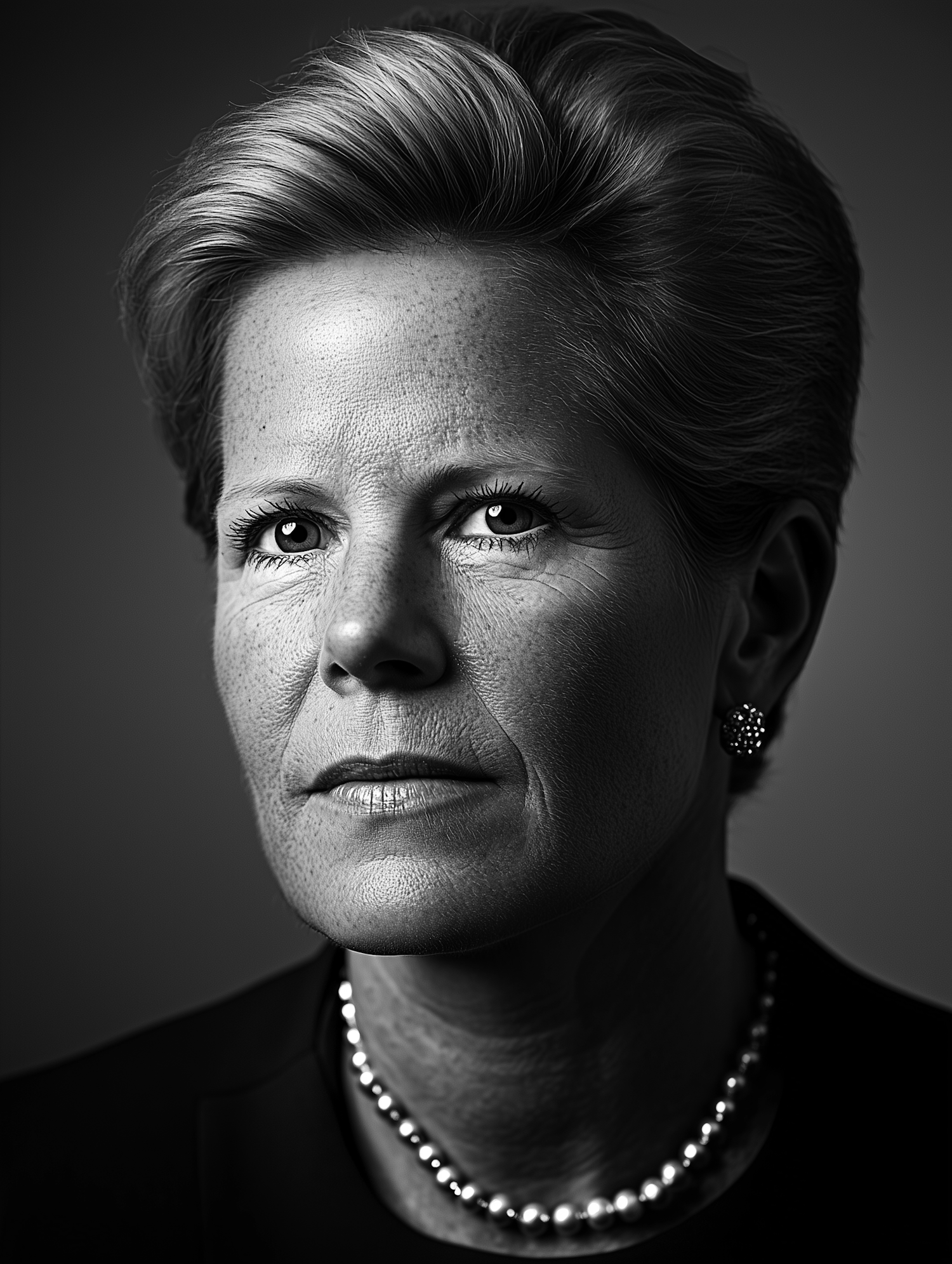 Black and white portrait of a middle-aged woman with short hair, pearl necklace, and earrings, exuding elegance and intensity.