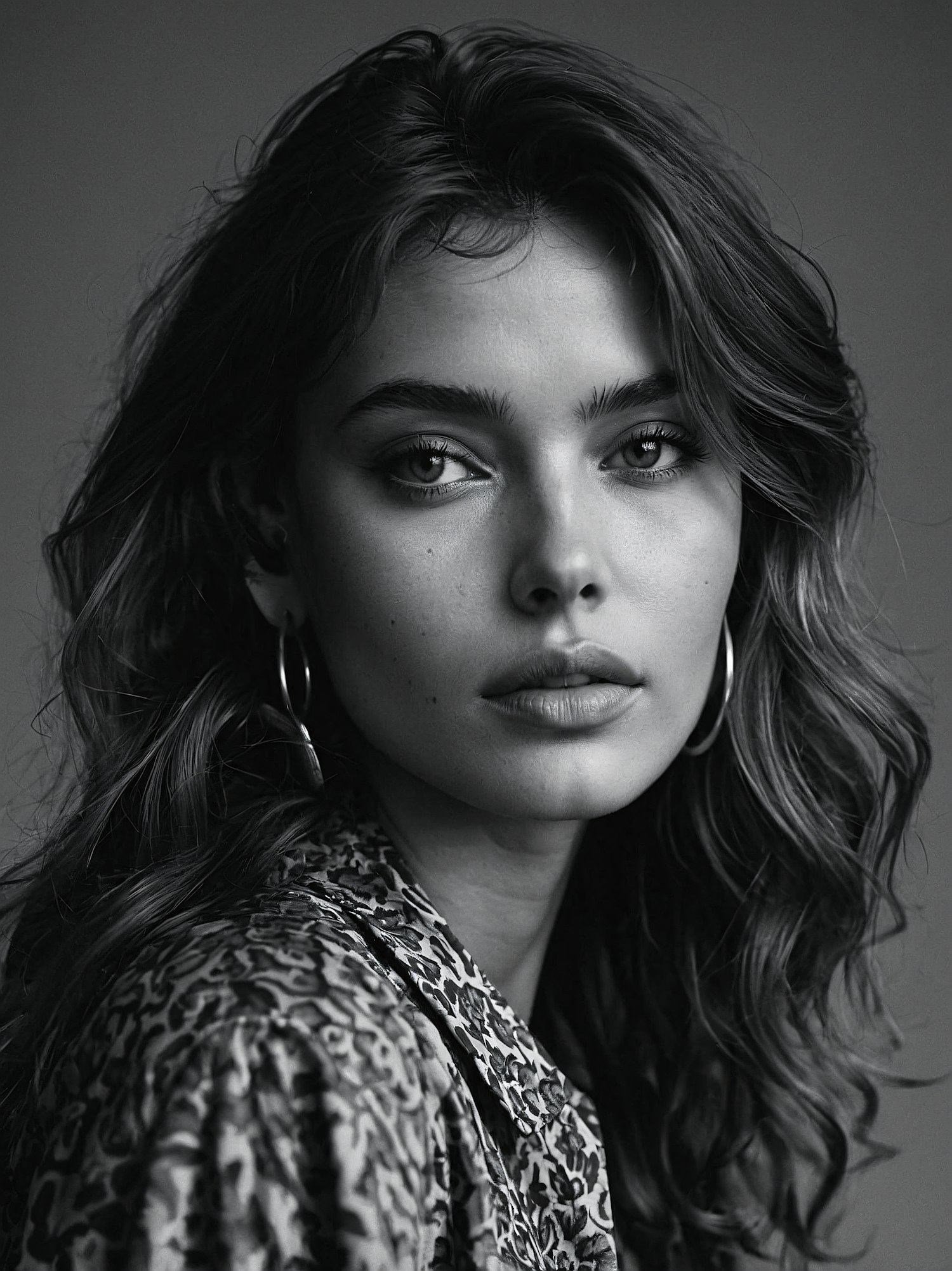 Black-and-white portrait of a young woman with wavy hair, hoop earrings, and a patterned blouse, exuding elegance and introspection.