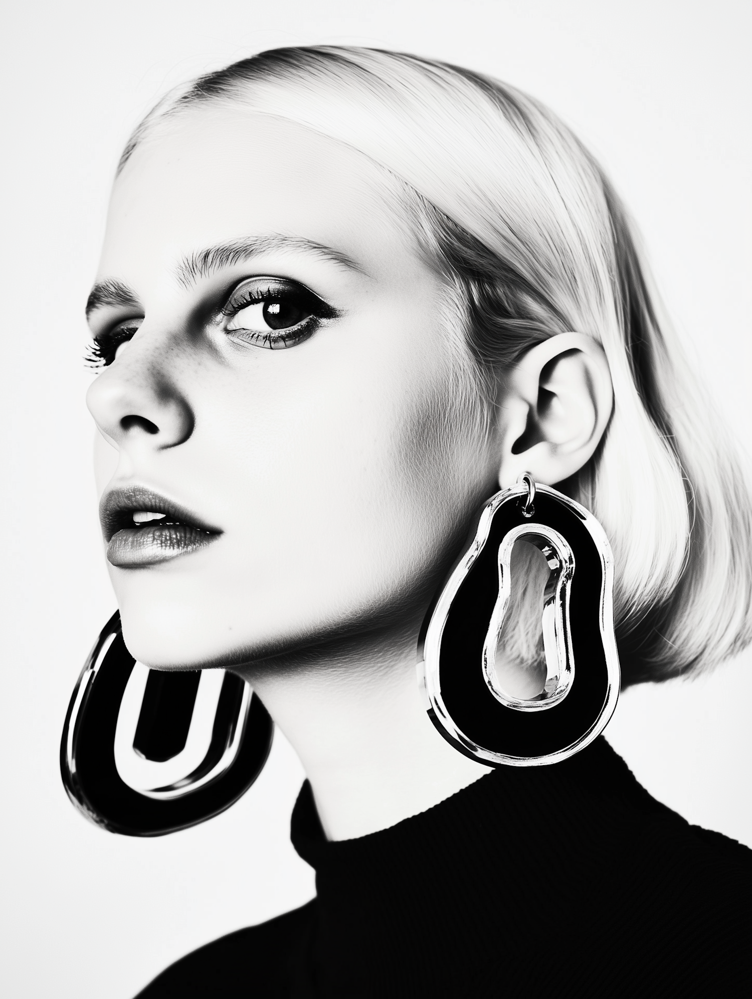 Black-and-white portrait of a woman with platinum blonde hair, bold earrings, and dramatic makeup, exuding a modern, high-fashion vibe.