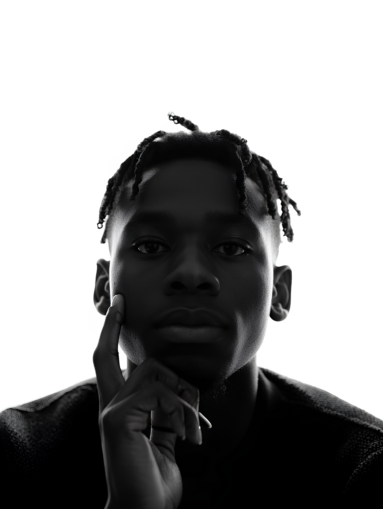 Striking black-and-white portrait of a young man with twisted dreadlocks, resting his chin on his hand against a bright white background.