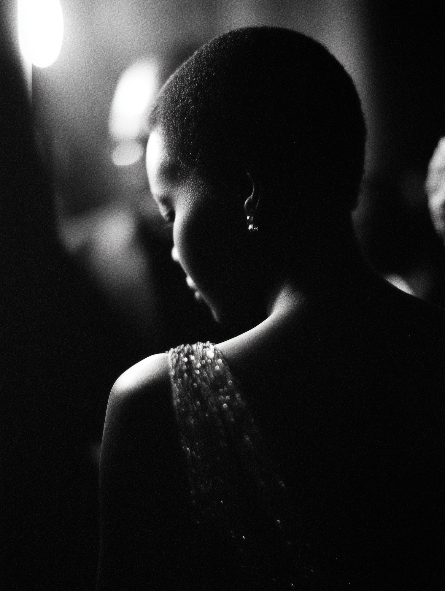 Elegant black-and-white portrait of a woman in a shimmering dress, captured in a serene, contemplative moment with soft lighting.
