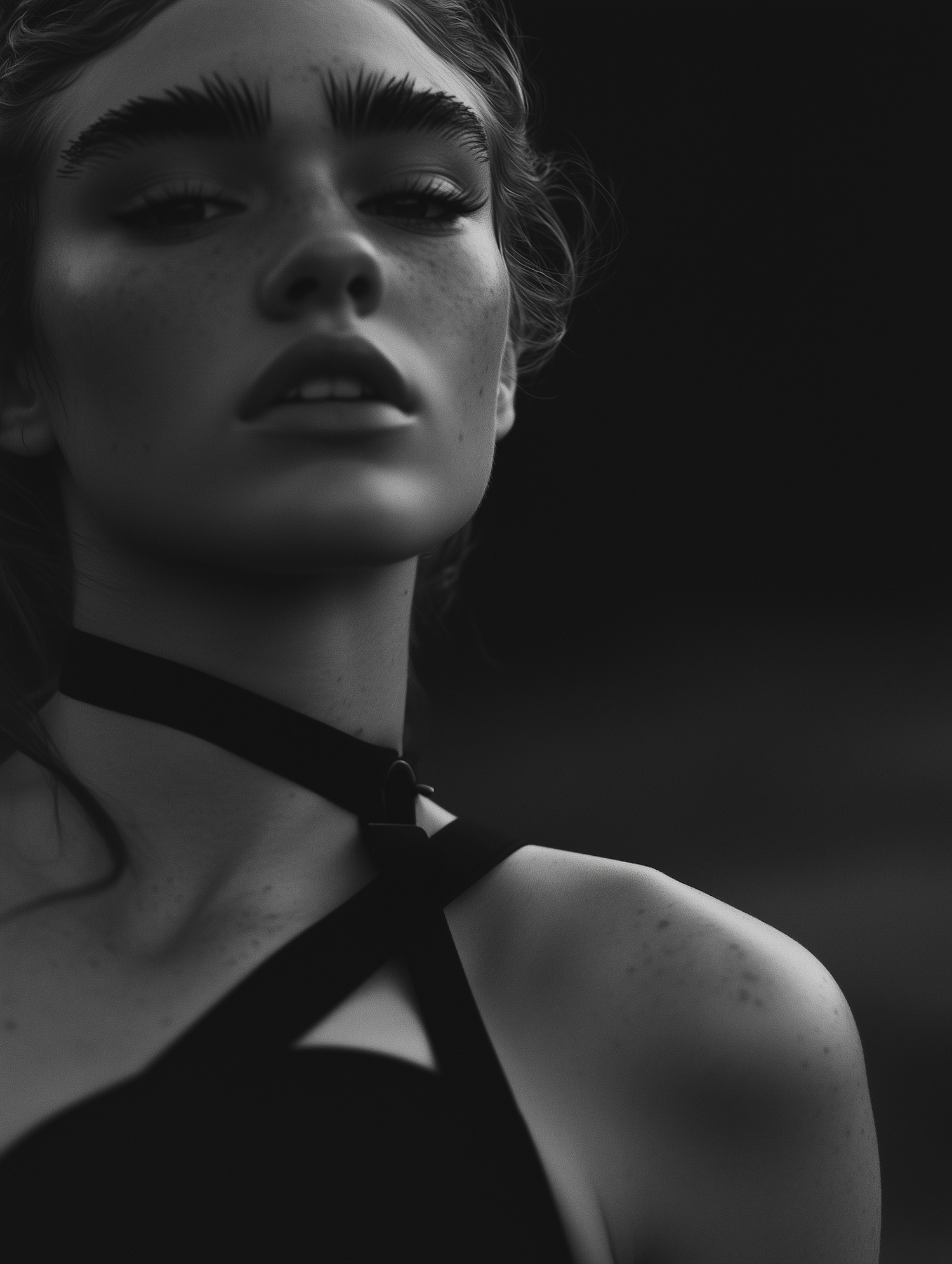Striking black-and-white portrait of a freckled woman with bold eyebrows, wearing a strappy black top against a dark background.
