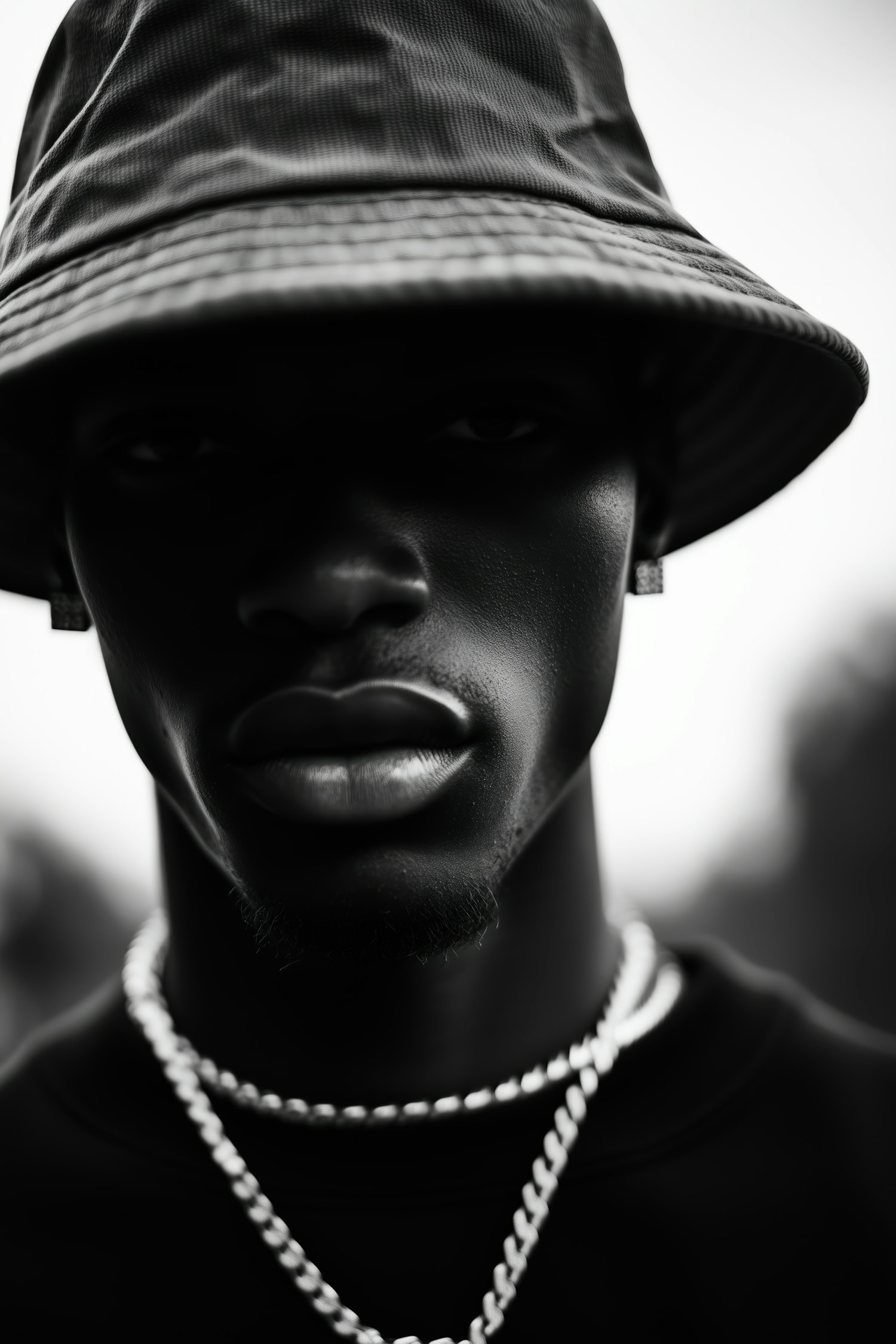 Moody black-and-white close-up of a man in a bucket hat, chain necklace, and earrings, with dramatic lighting and blurred background.