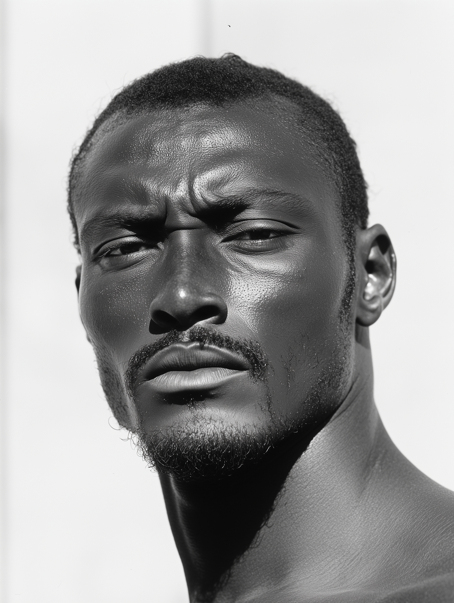 Black-and-white portrait of a man with dark skin, short hair, and a confident expression, highlighted by dramatic lighting.