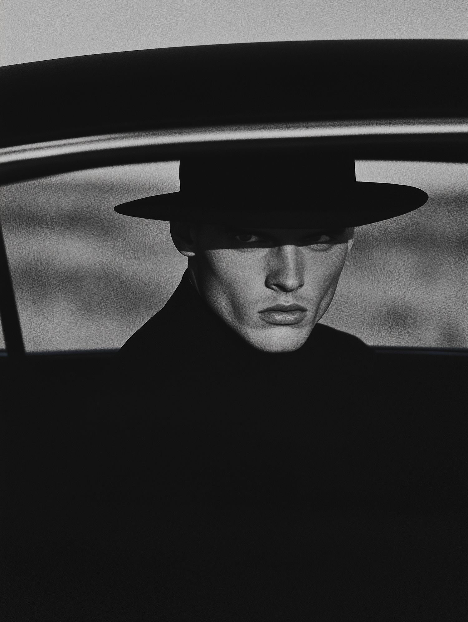 Mysterious figure in a car, wearing a wide-brimmed hat, captured in dramatic black and white photography.