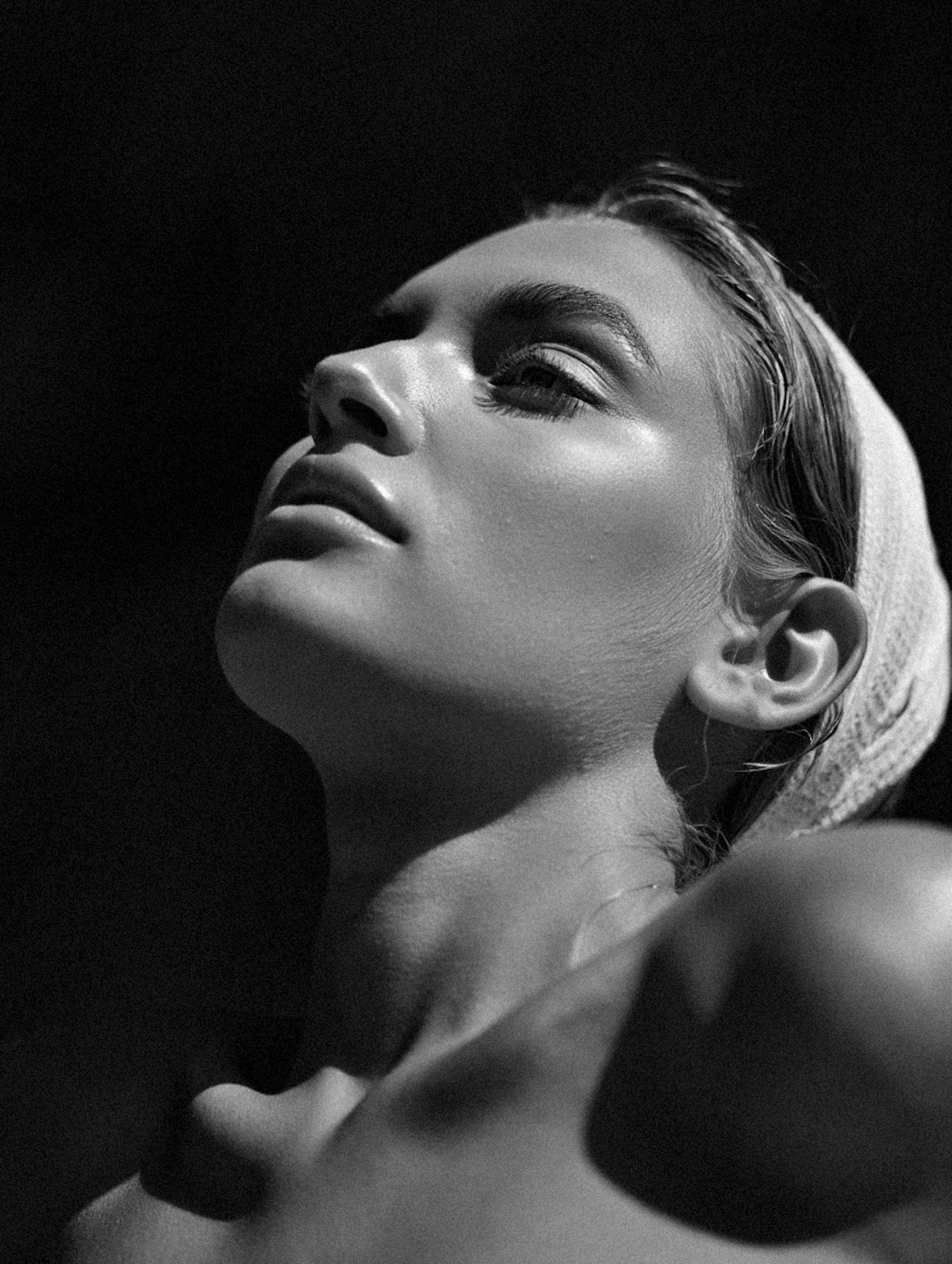 Striking black-and-white portrait of a woman with glowing skin, slicked-back hair, and serene expression against a dark background.