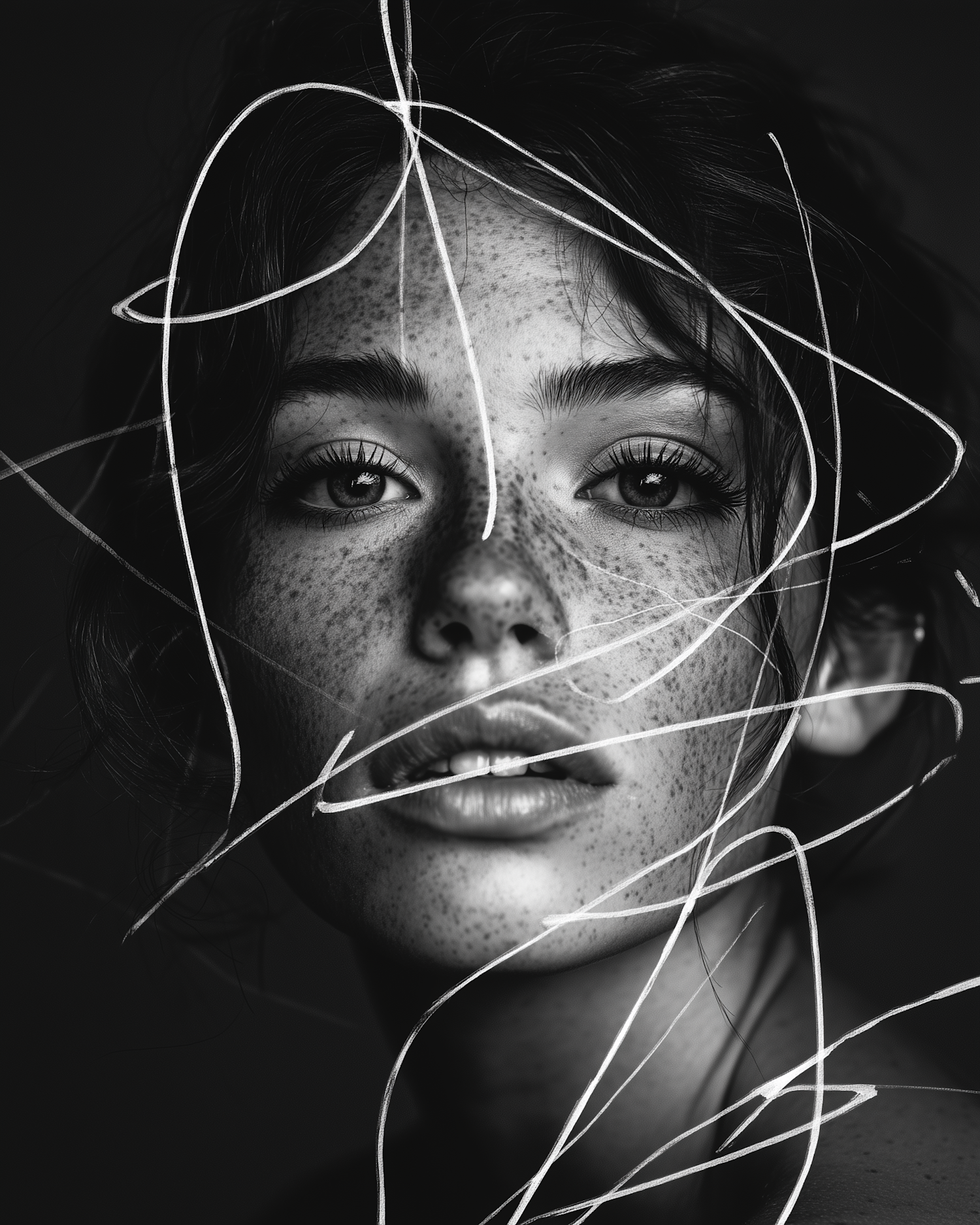 Artistic black-and-white portrait of a freckled woman with thread-like lines, creating a surreal and captivating visual effect.