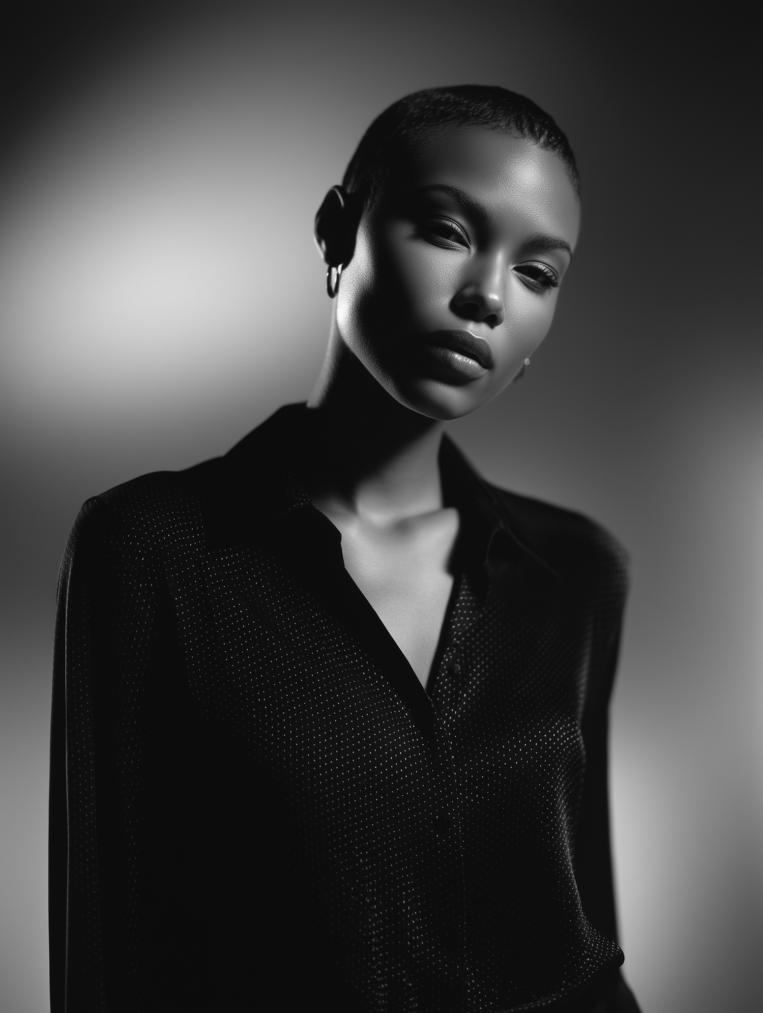 Elegant black-and-white portrait of a young woman with a cropped hairstyle, wearing a textured blouse, in soft dramatic lighting.