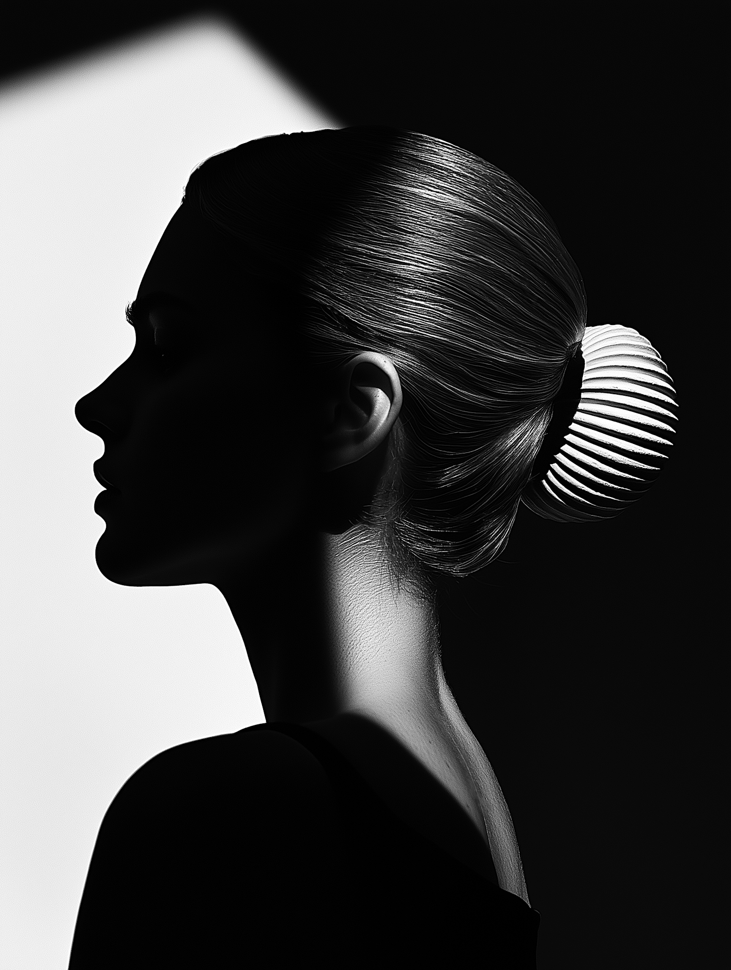 Elegant black-and-white profile portrait of a woman with a sleek bun and dramatic lighting, highlighting her contours and modern hair accessory.