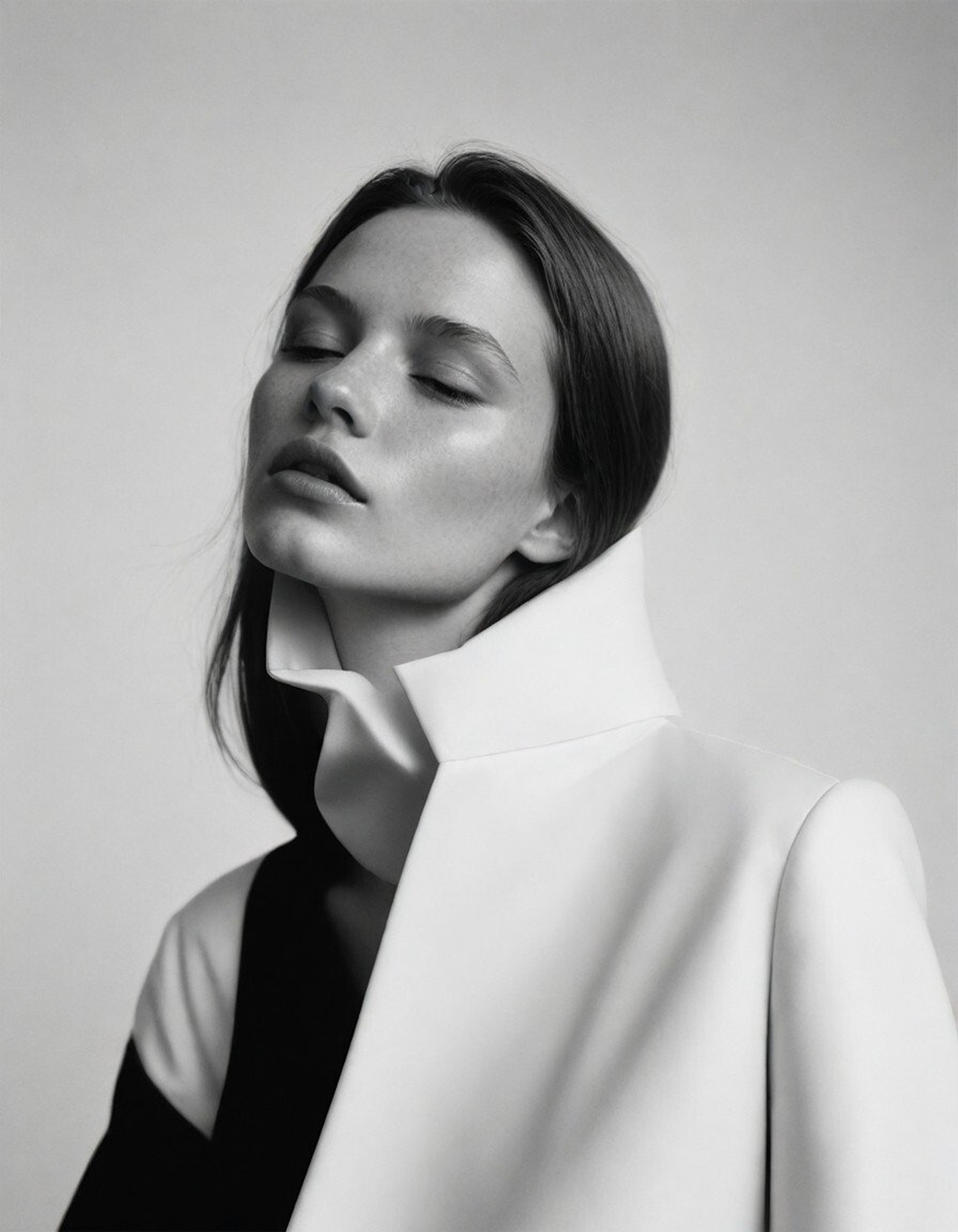 Black-and-white portrait of a serene woman in a high-collared, structured outfit with striking contrasts and soft lighting.
