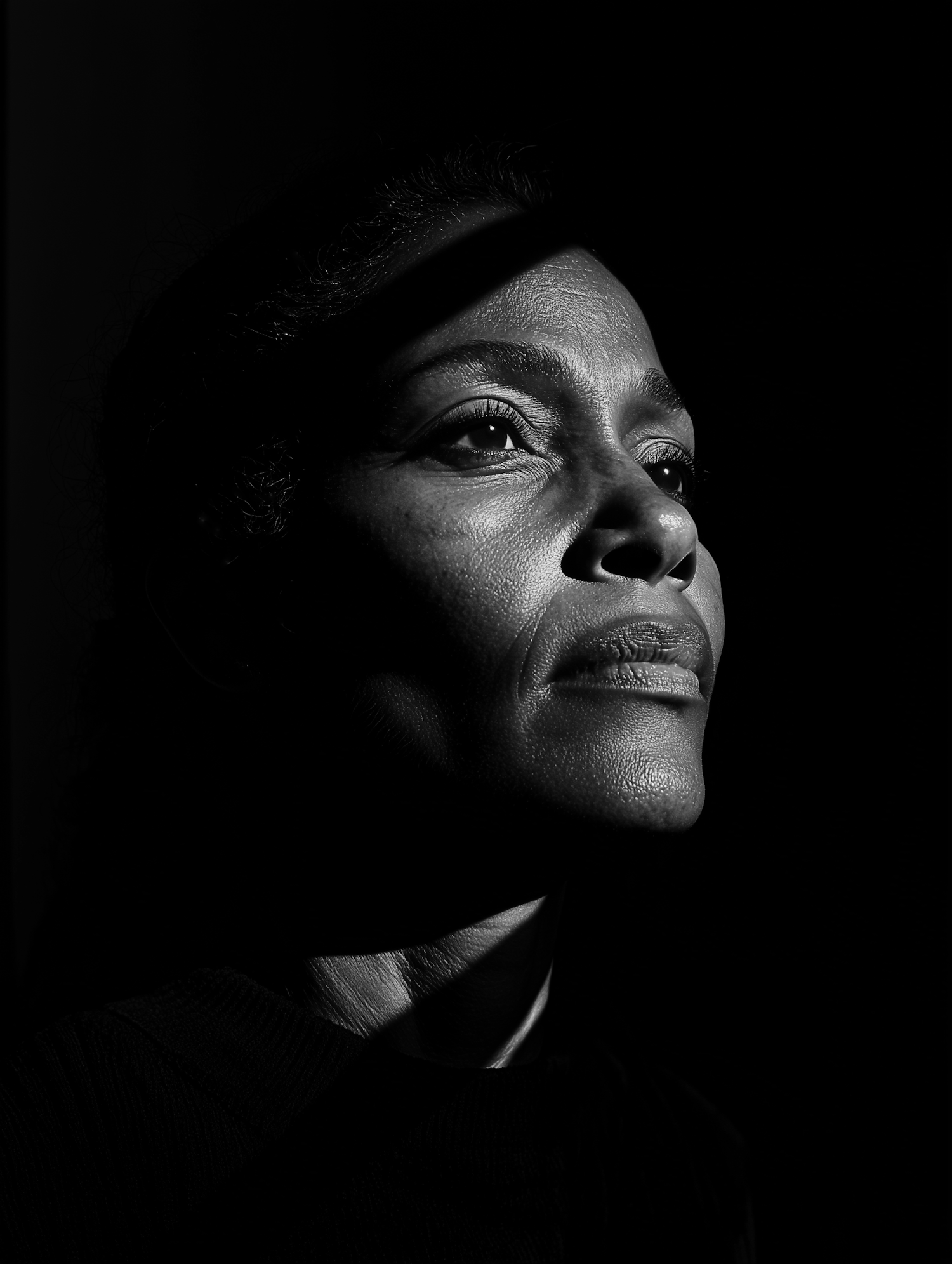 Dramatic black and white portrait of a woman with a contemplative gaze, highlighted by striking light and shadow contrast.