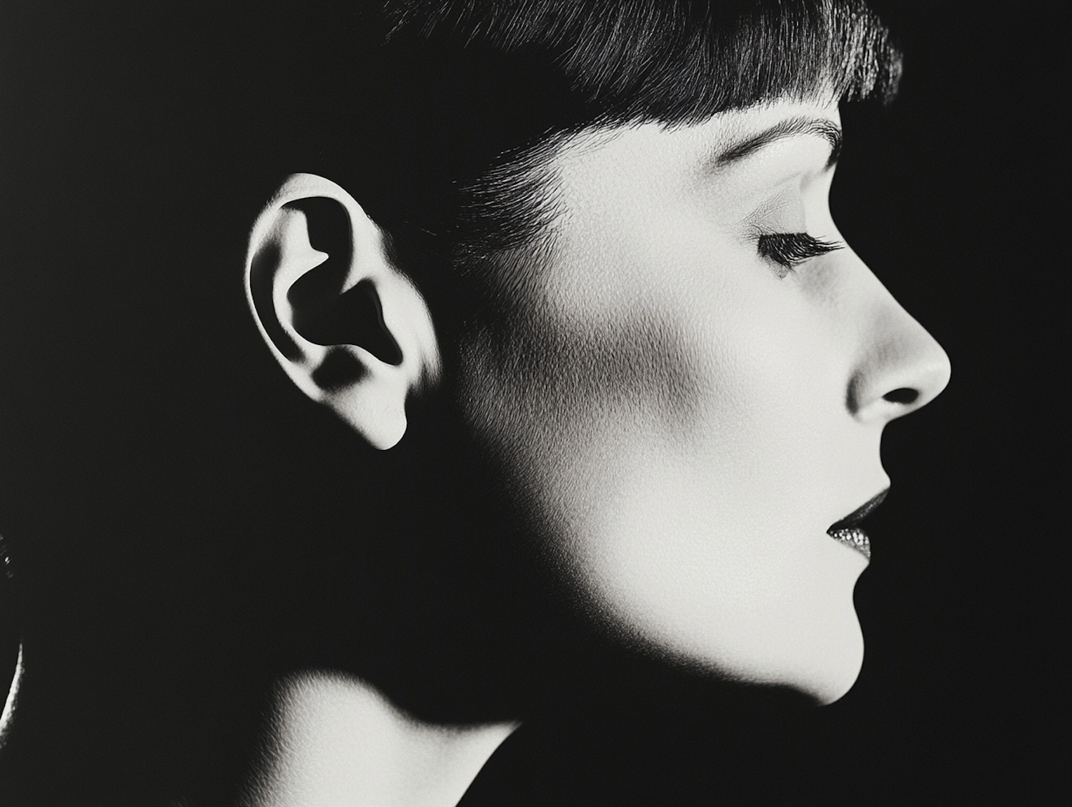 Striking black and white profile portrait of a woman with closed eyes and defined features against a dark background.