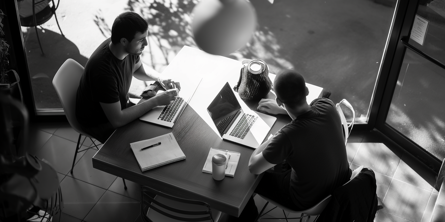 Two men working on laptops in a sunlit cafe, captured in black and white, creating a focused and serene atmosphere.