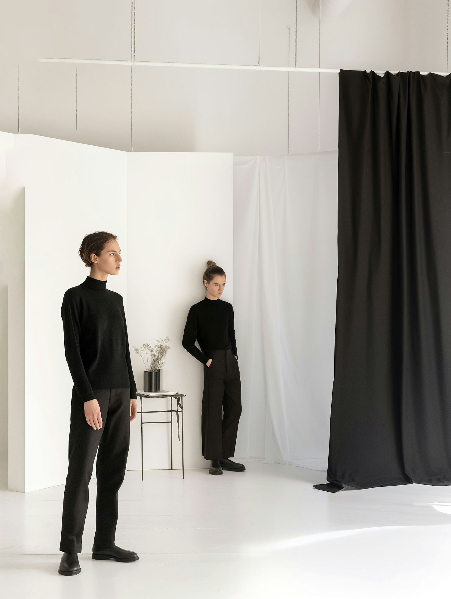 Minimalist scene with two women in black outfits against white walls and a black curtain, creating a striking contrast.