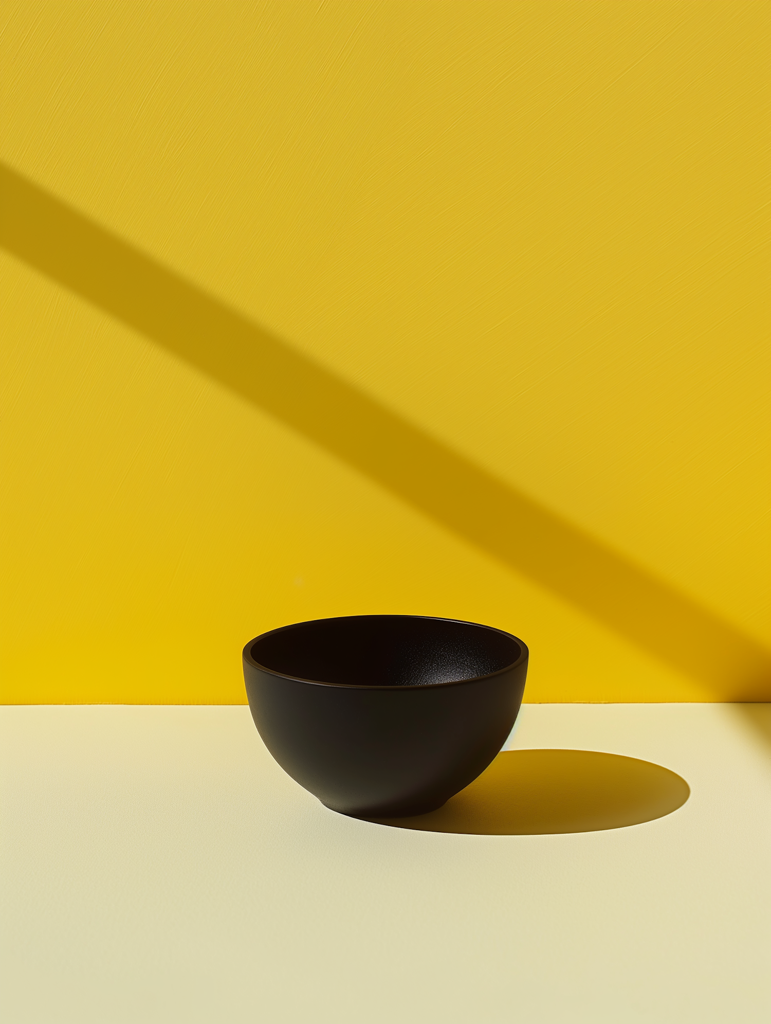 Minimalist black bowl on a cream surface with a vibrant yellow background and dramatic shadows.