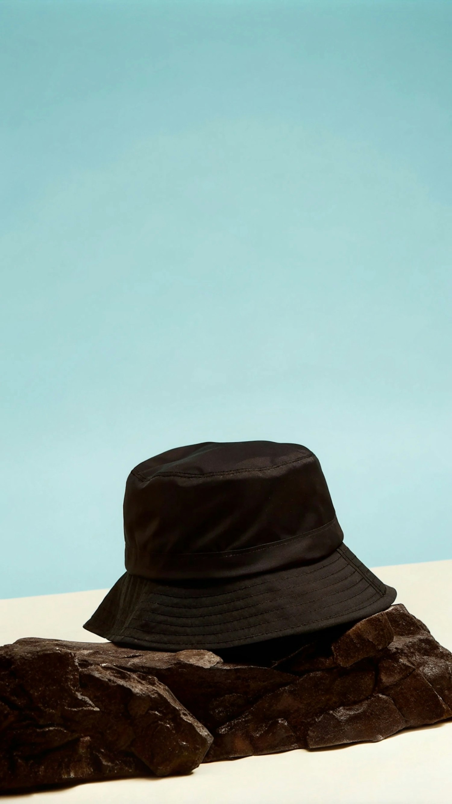 Black bucket hat on textured rocks with a light blue background, creating a minimalistic and stylish composition.