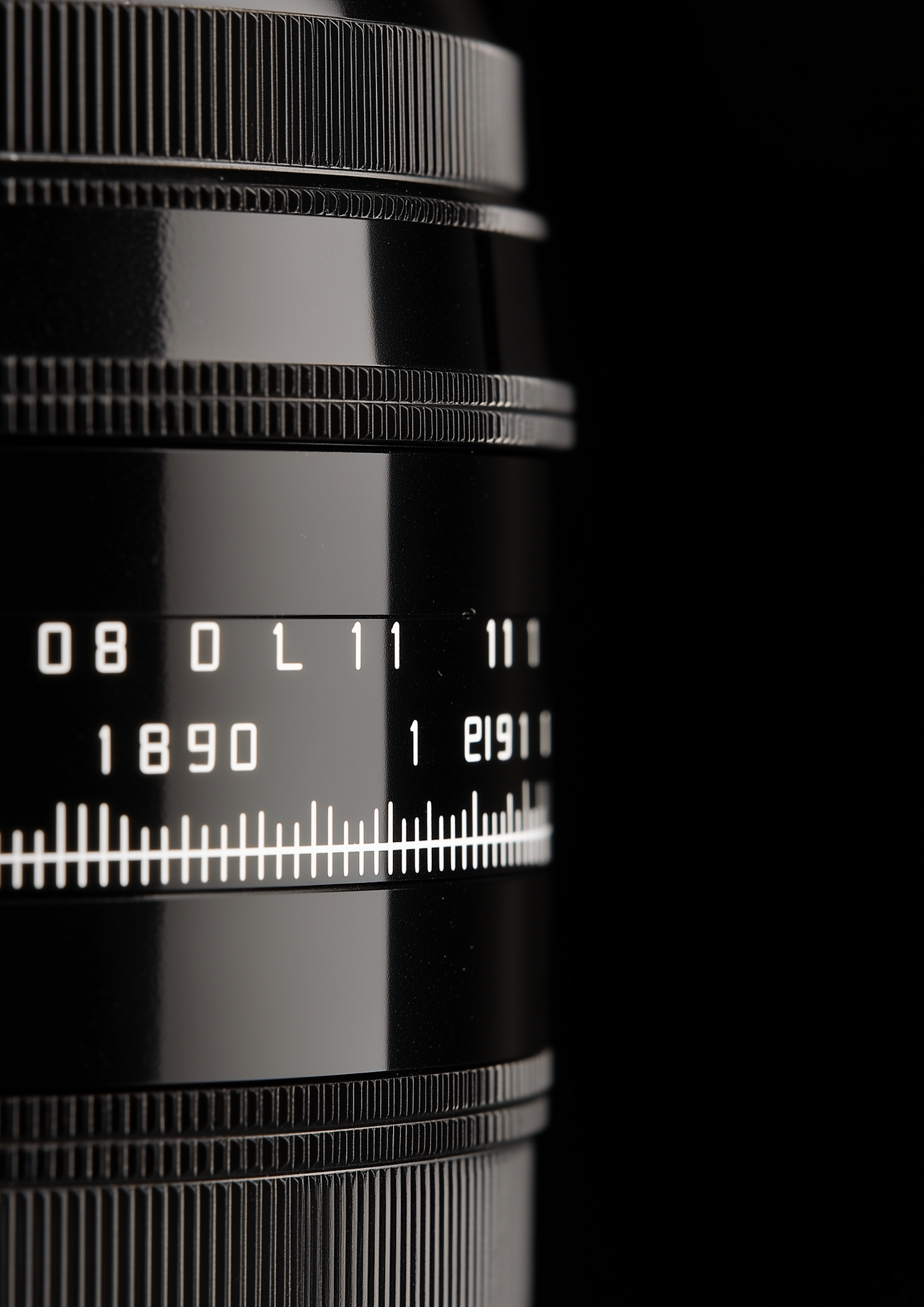 Close-up of a sleek black camera lens with white markings and textured grip rings, set against a black background.