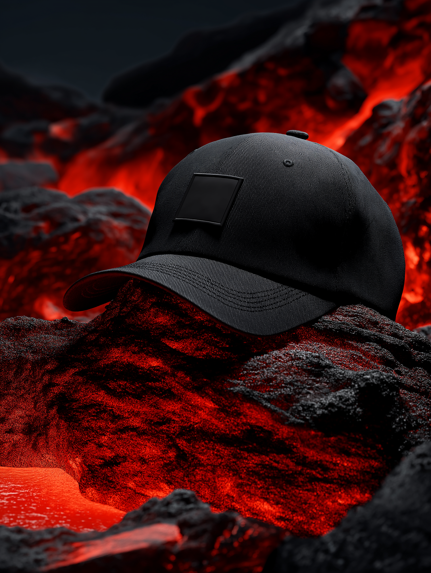 A black baseball cap with a square patch sits on glowing volcanic rock, contrasting its sleek design with the fiery red lava background.