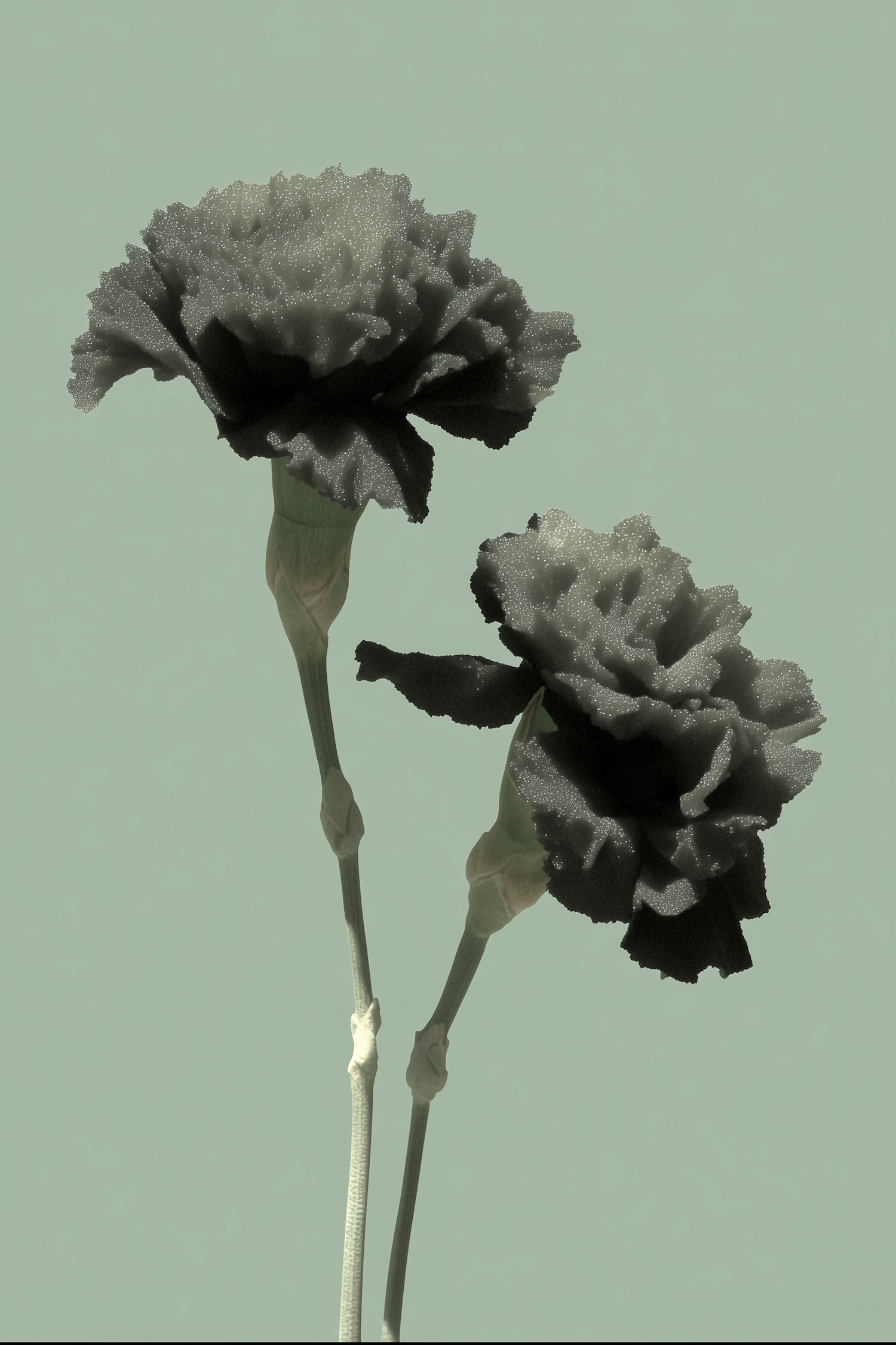 Two black carnations with textured petals stand out against a muted green background, creating a striking and minimalistic floral composition.