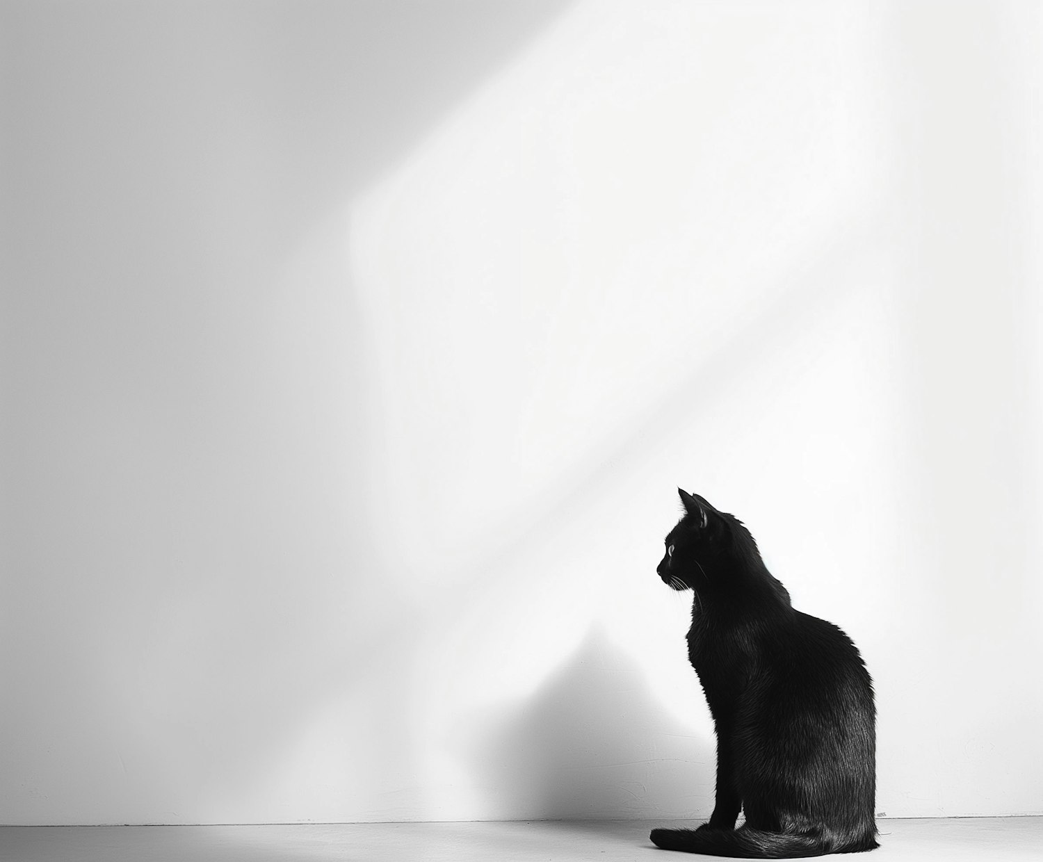 A sleek black cat sits on a light floor, casting a shadow on a white wall. Minimalist setting with elegant silhouette and soft lighting.