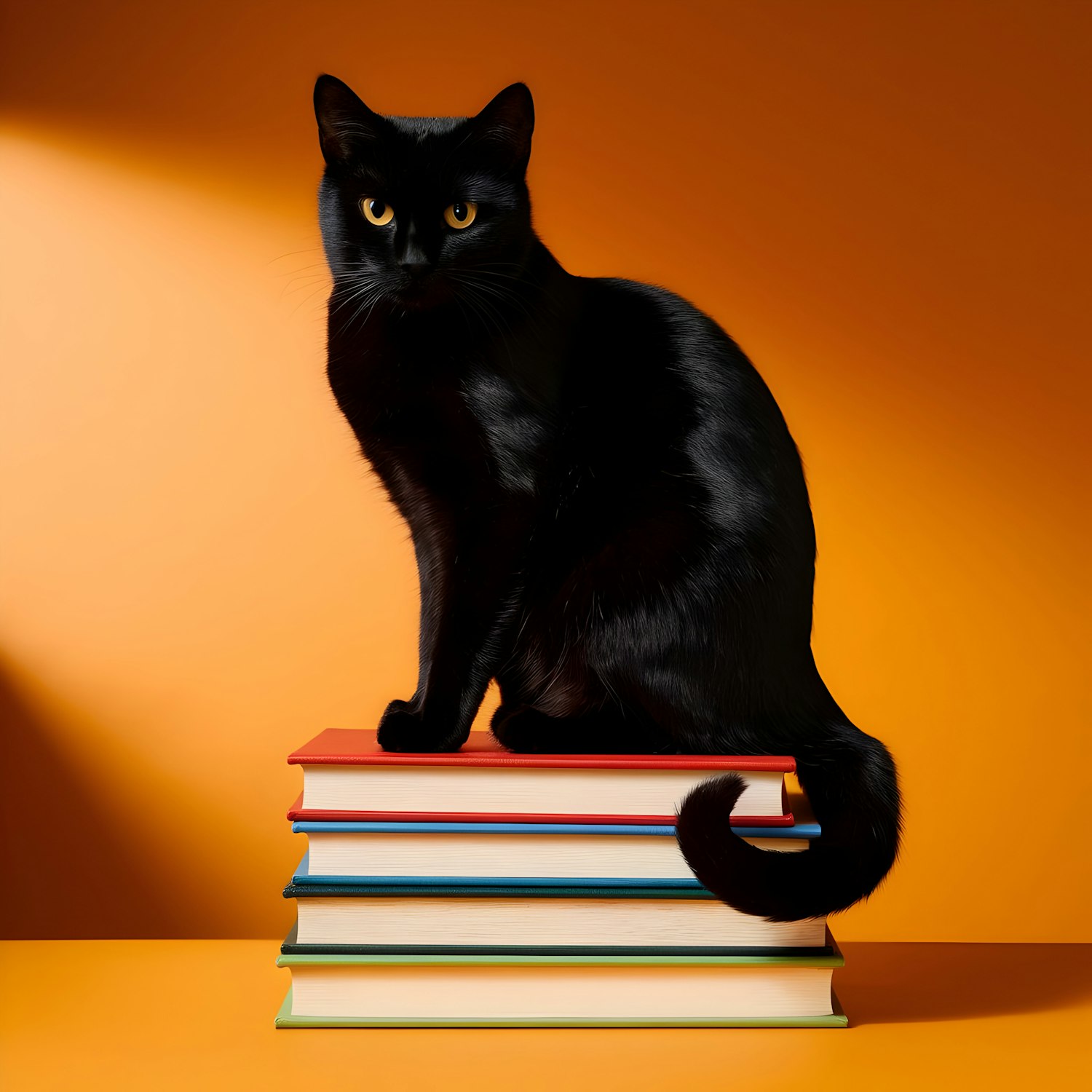 A black cat with glowing yellow eyes sits on colorful books against a warm orange background, creating a dramatic and artistic vibe.