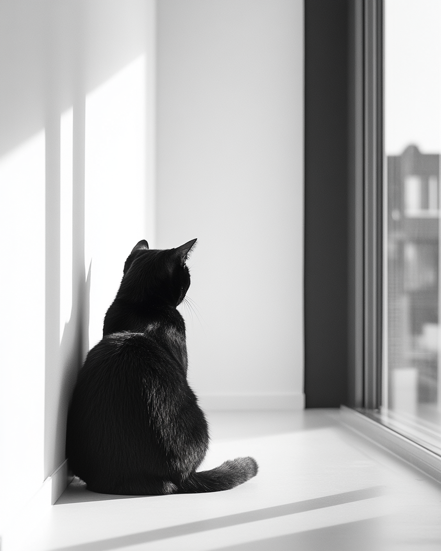 A black cat sits on a white windowsill, gazing outside. Minimalist scene with soft shadows and a serene atmosphere.