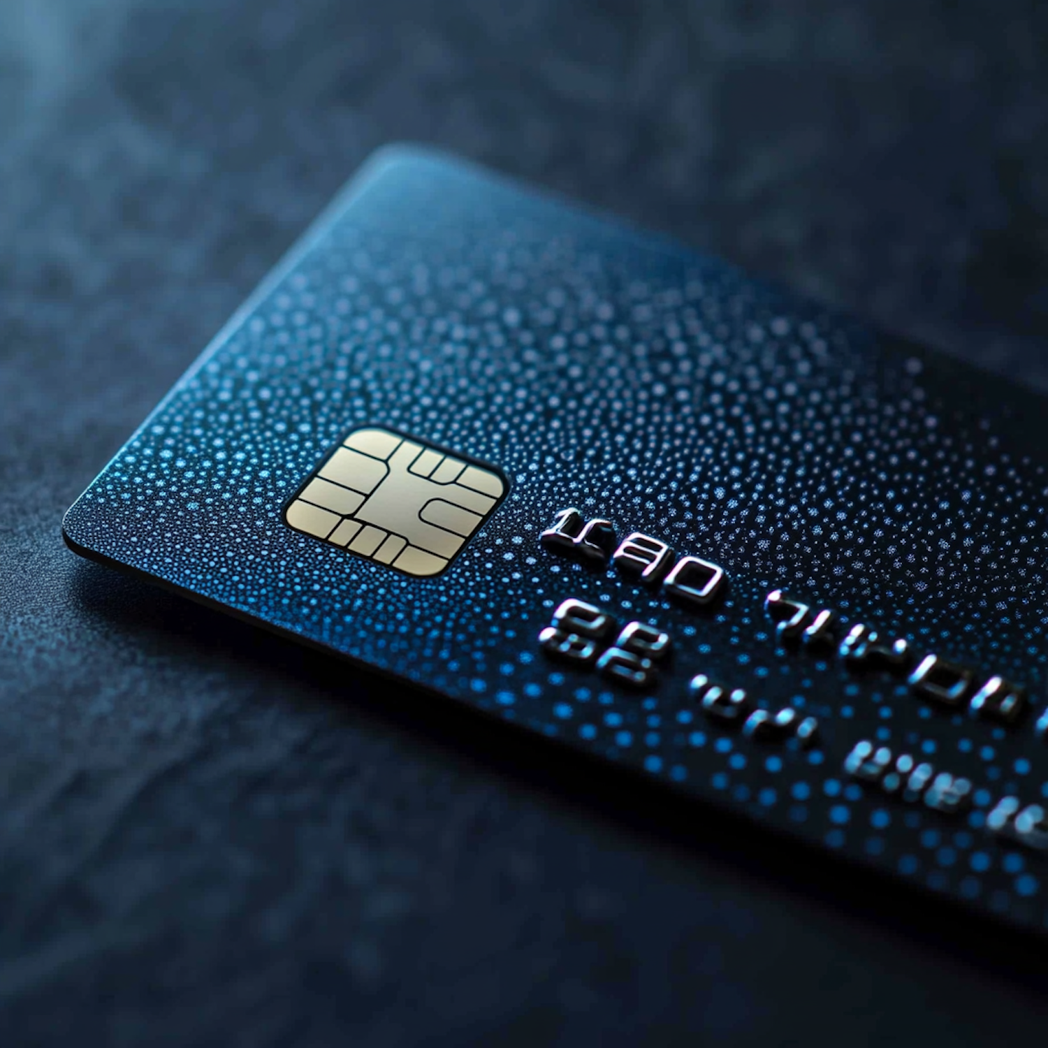 Close-up of a sleek blue credit card with a metallic chip and embossed numbers, set against a dark textured background.
