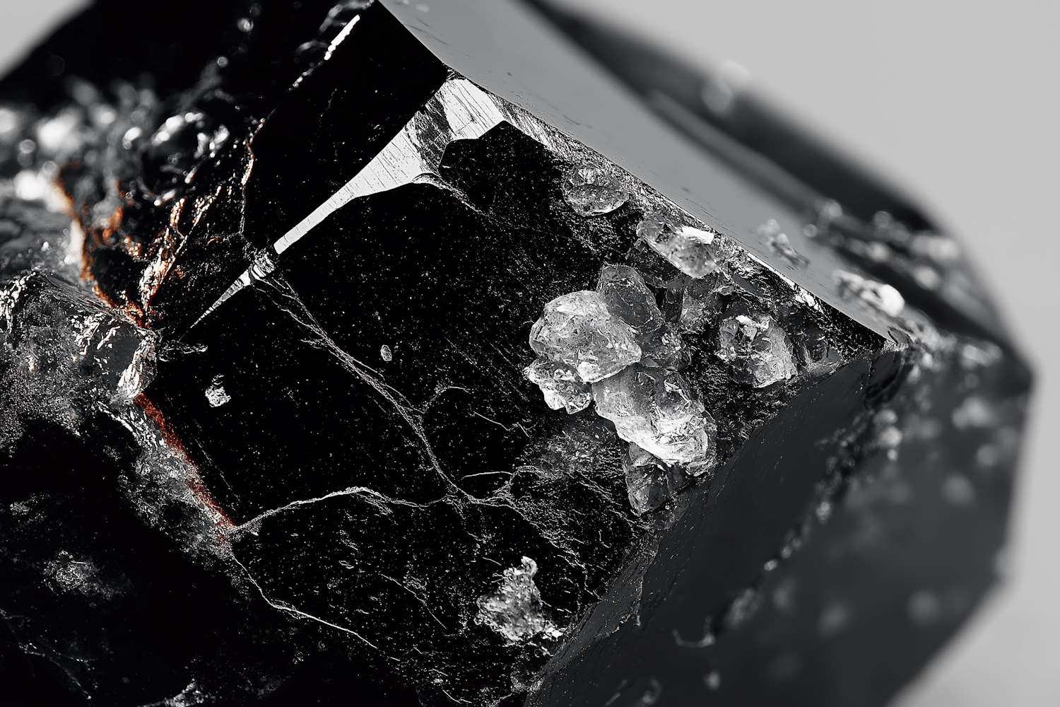 Close-up of a black mineral crystal with embedded clear crystals, showcasing sharp edges and reflective surfaces in fine detail.