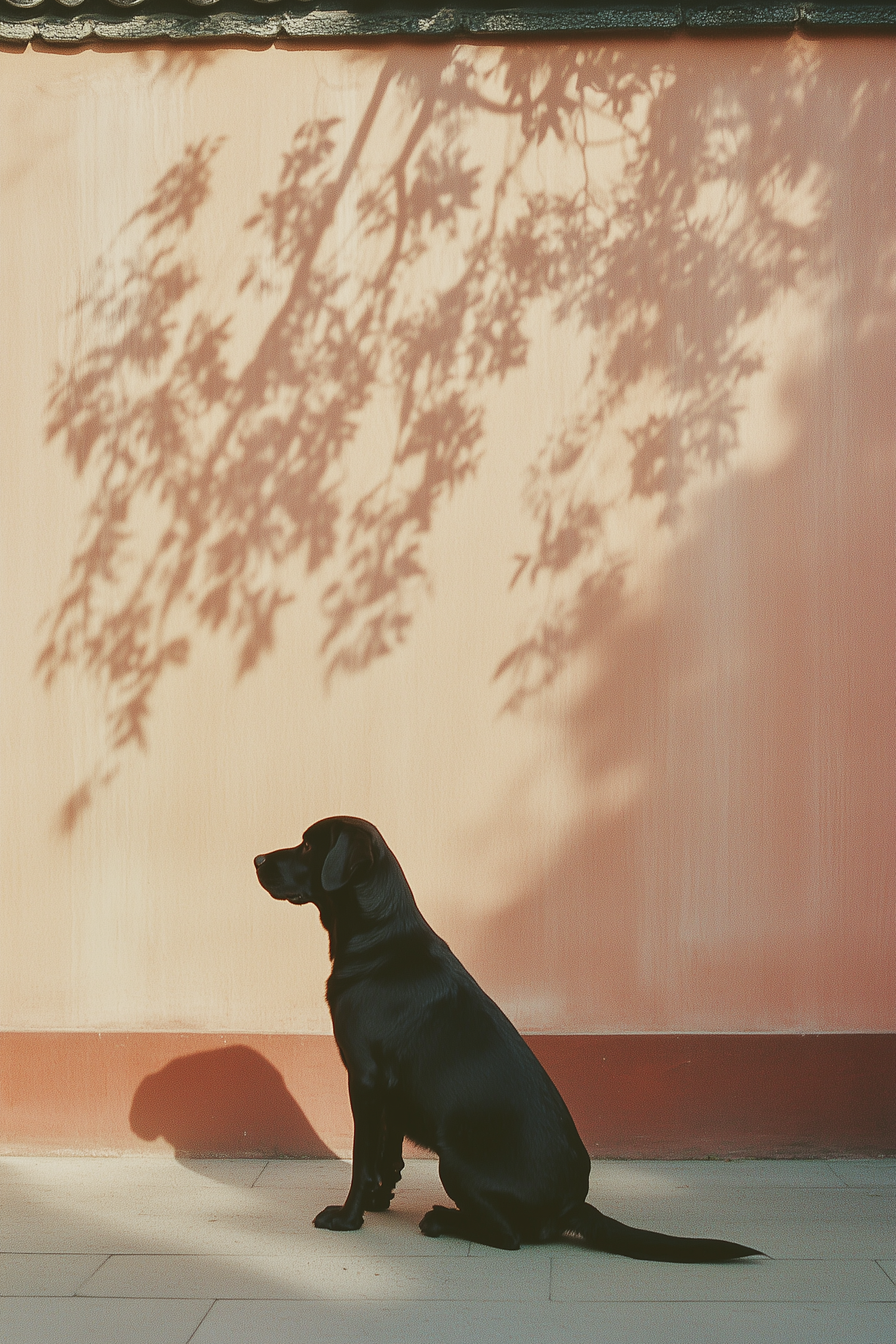 Black Labrador sits against a peach wall with tree shadows, creating a serene and artistic scene.