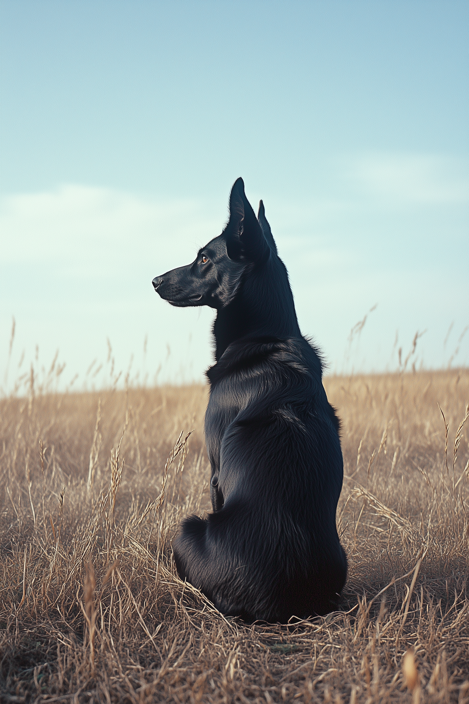 A sleek black dog sits in a golden field under a clear blue sky, exuding calm and alertness in a serene natural setting.