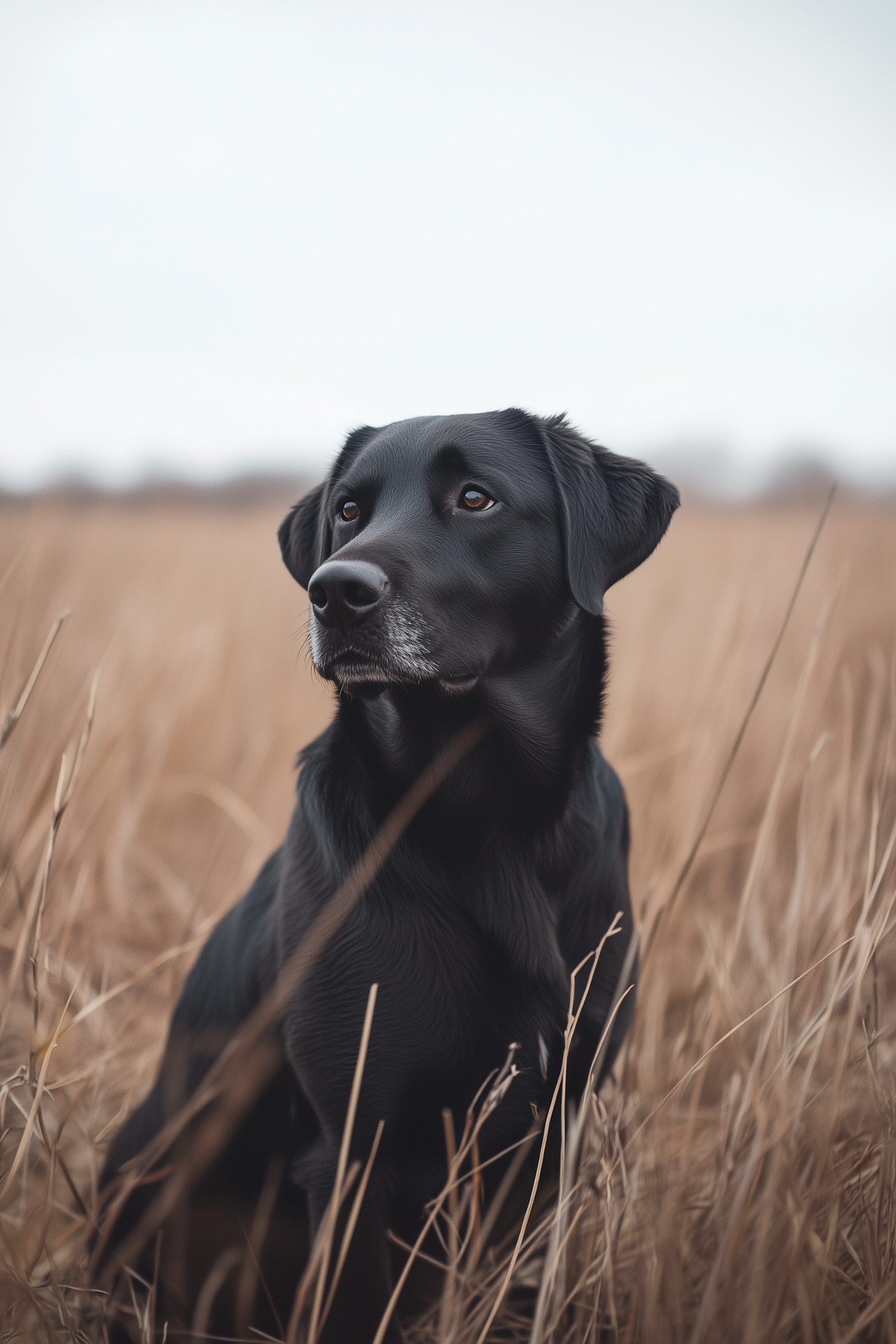 Black Labrador Retriever in a field of tall, dry grass, gazing attentively into the distance under an overcast sky.