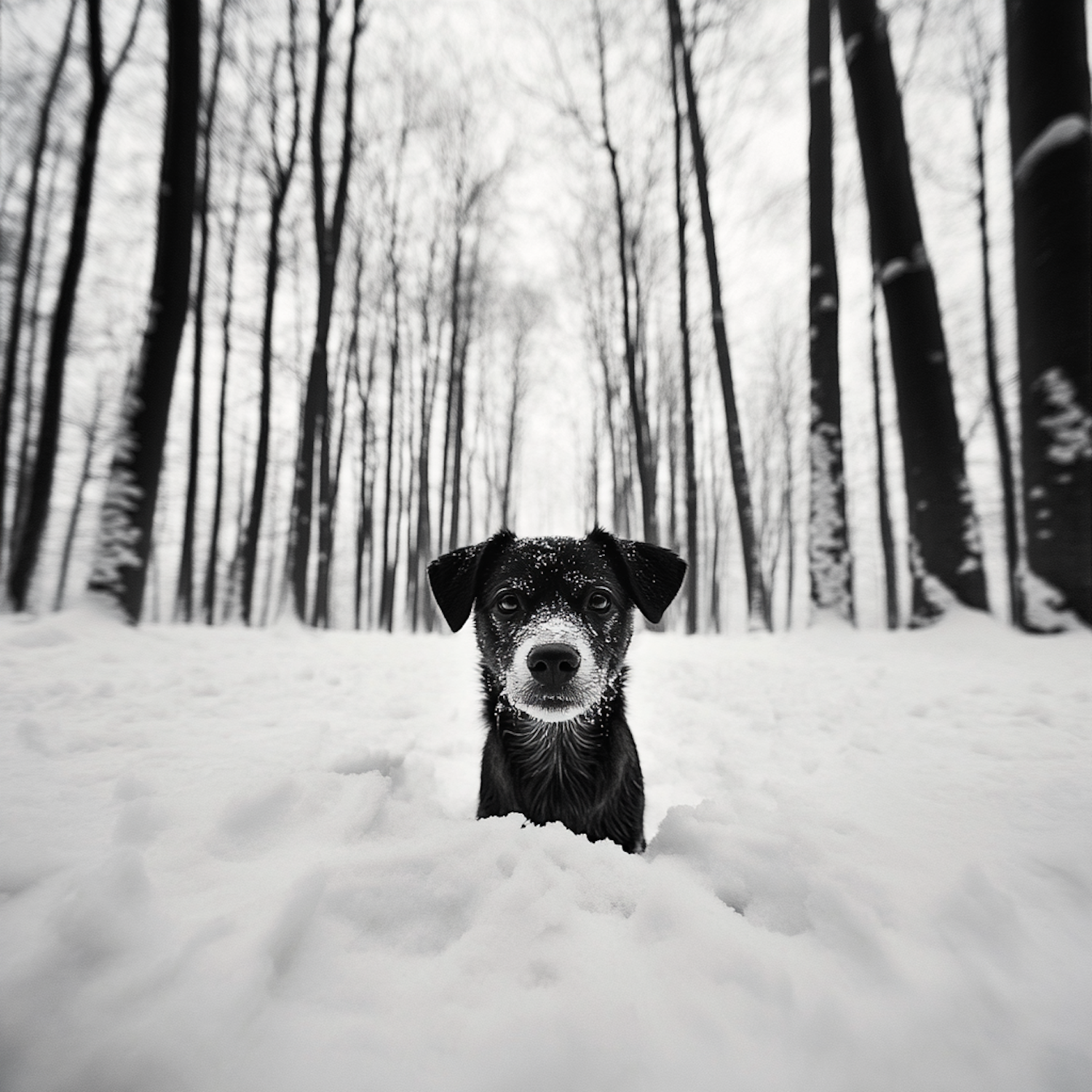 A black dog in a snowy forest, surrounded by tall trees, with snowflakes on its fur, creating a serene winter scene.