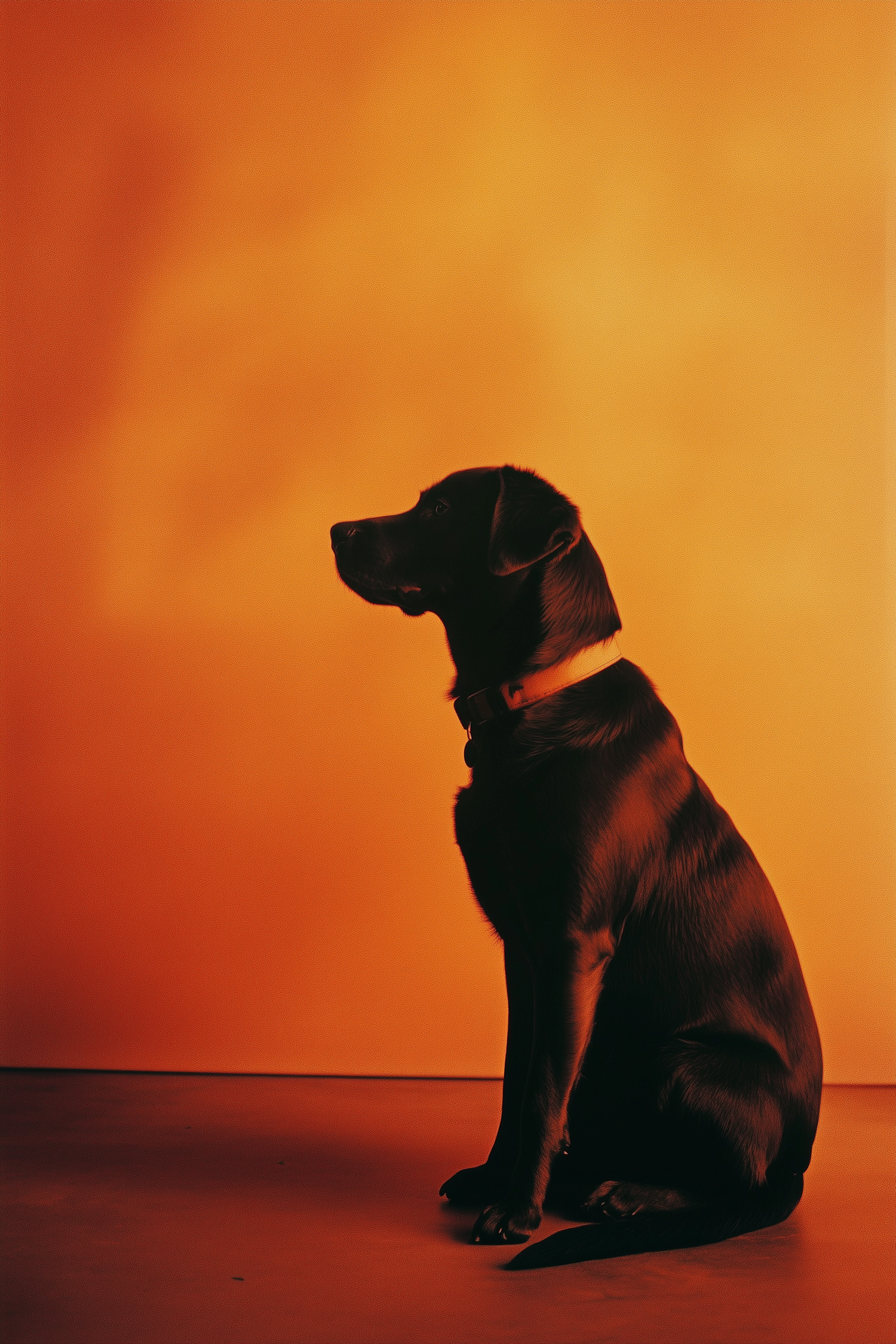 Black dog in profile against a vibrant orange background, creating a striking silhouette.