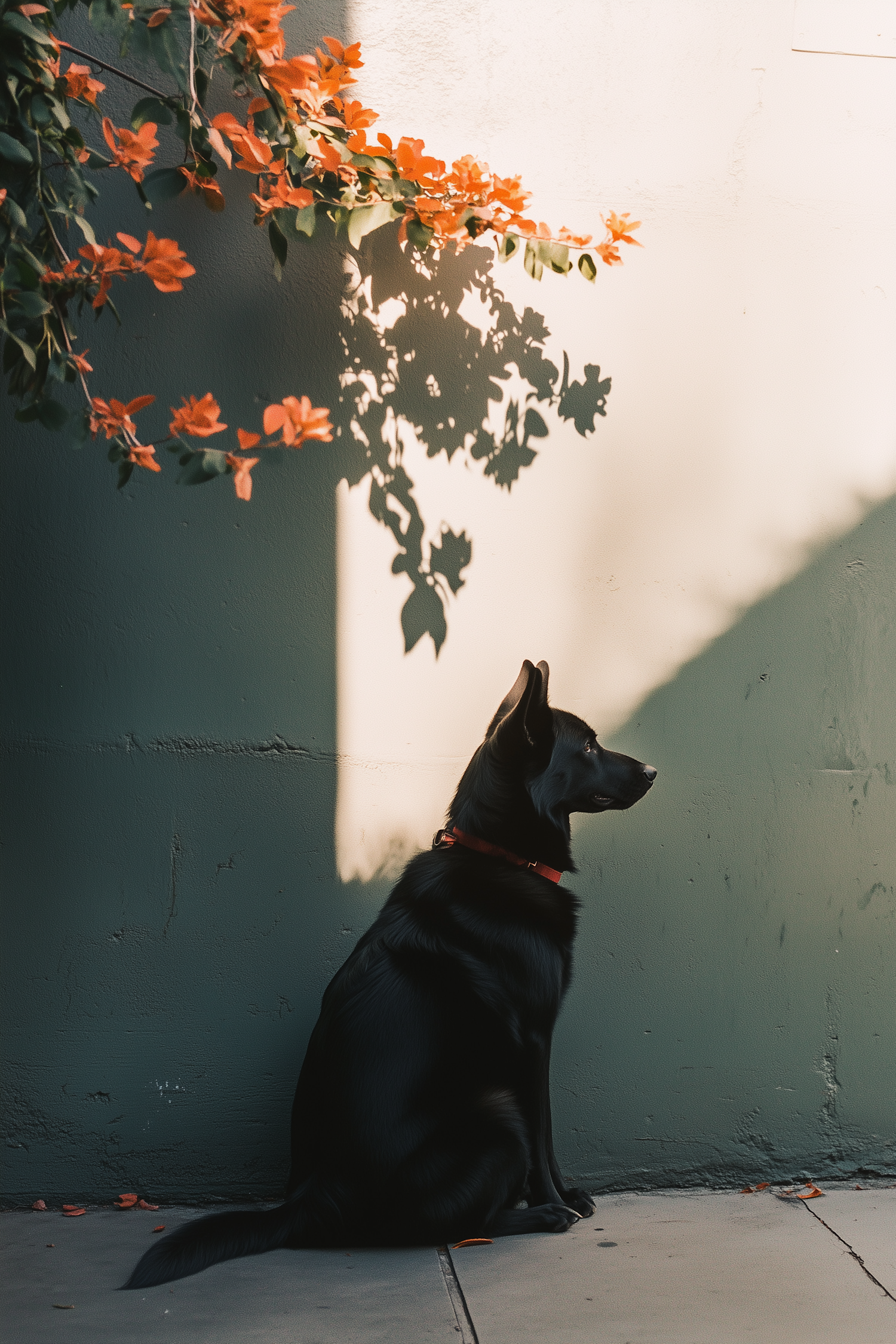 A black dog with a red collar sits by a wall, under orange flowers casting shadows. Sunlight enhances the serene scene.