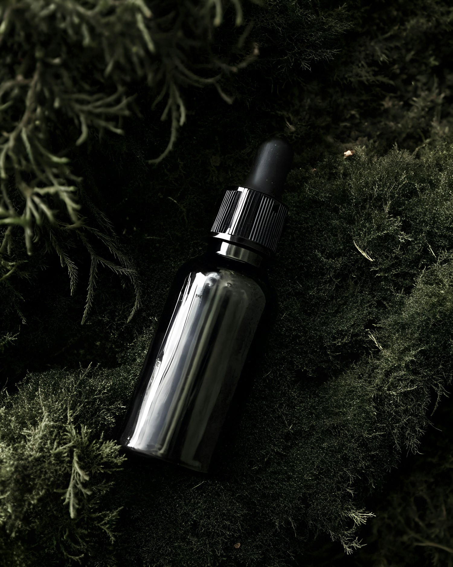 A black dropper bottle resting on lush green moss, creating a natural and eco-friendly aesthetic with soft, moody lighting.