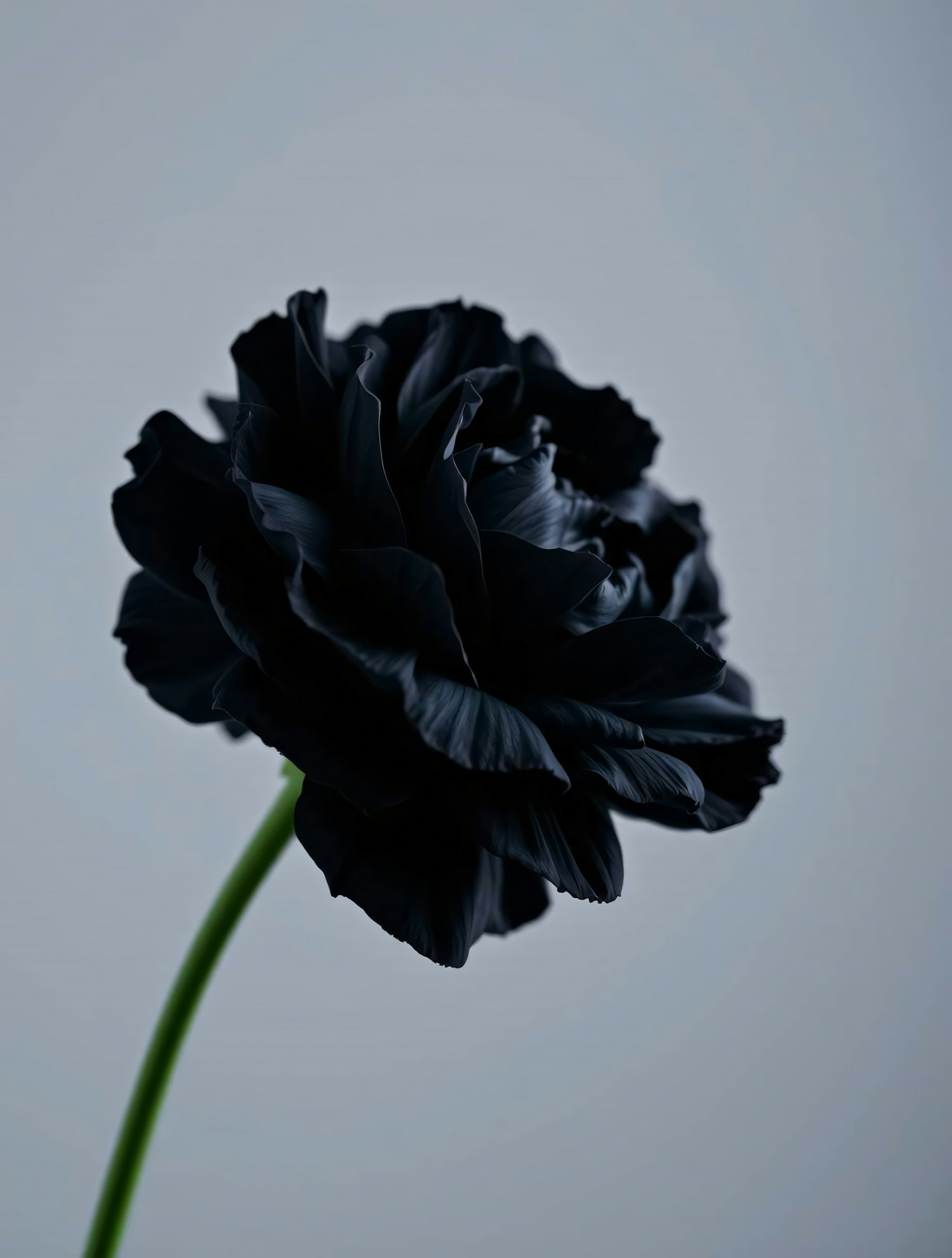 Close-up of a black flower with velvety petals against a muted gray background, highlighting its intricate textures and dramatic elegance.