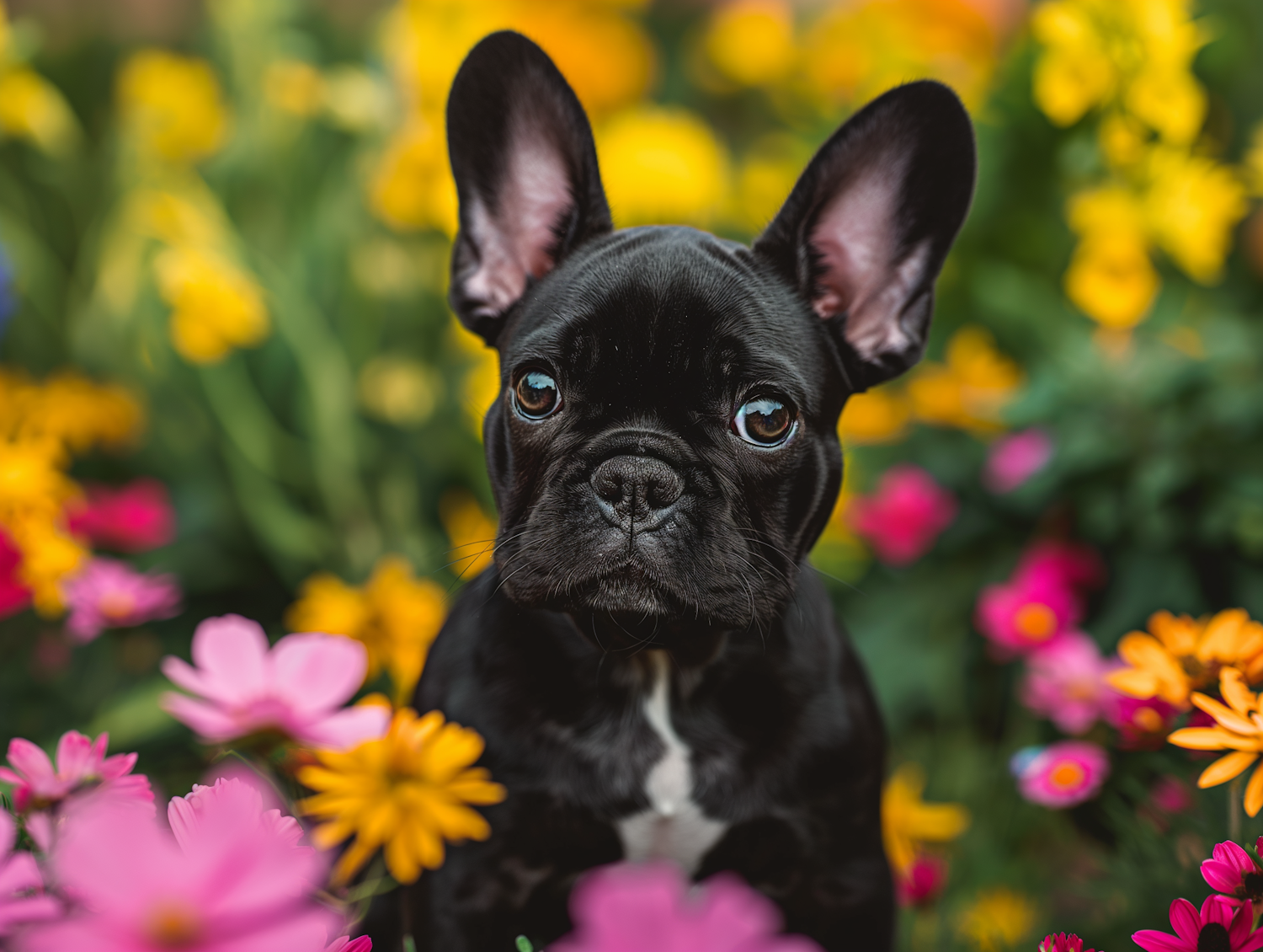 Adorable black French Bulldog puppy surrounded by vibrant pink, yellow, and orange flowers in a lush garden setting.
