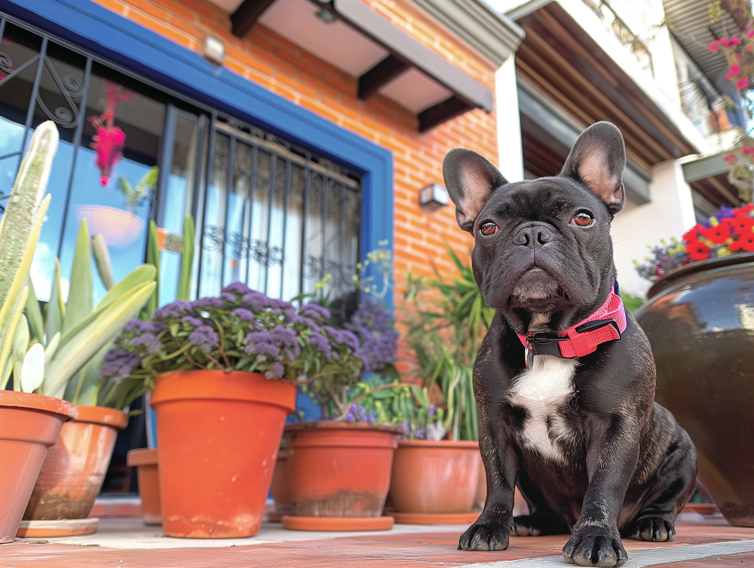 Black French Bulldog with pink collar sits among potted plants on a patio, against a brick wall and blue window frame.