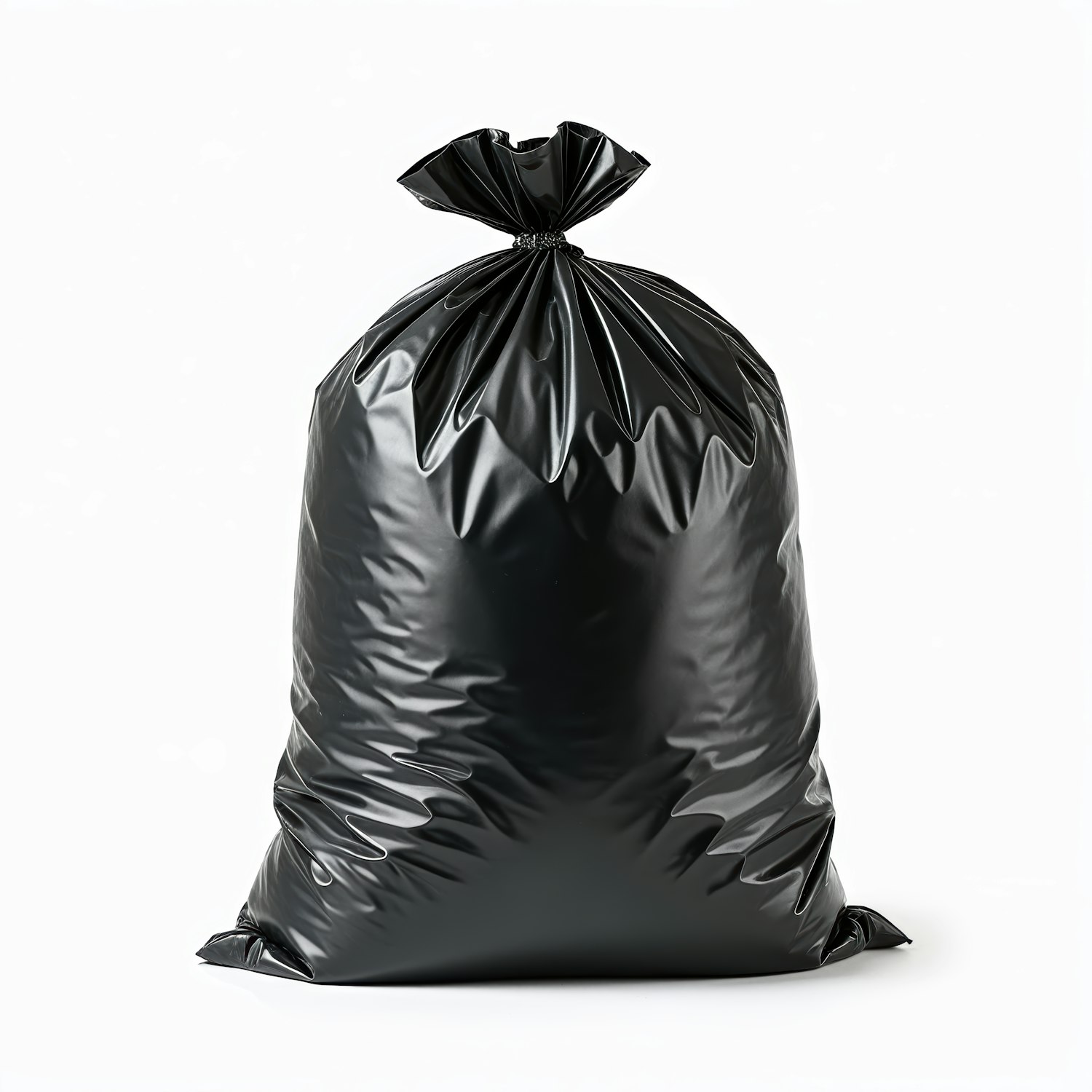 A shiny black garbage bag stands upright against a white background, showcasing its glossy texture and filled shape.
