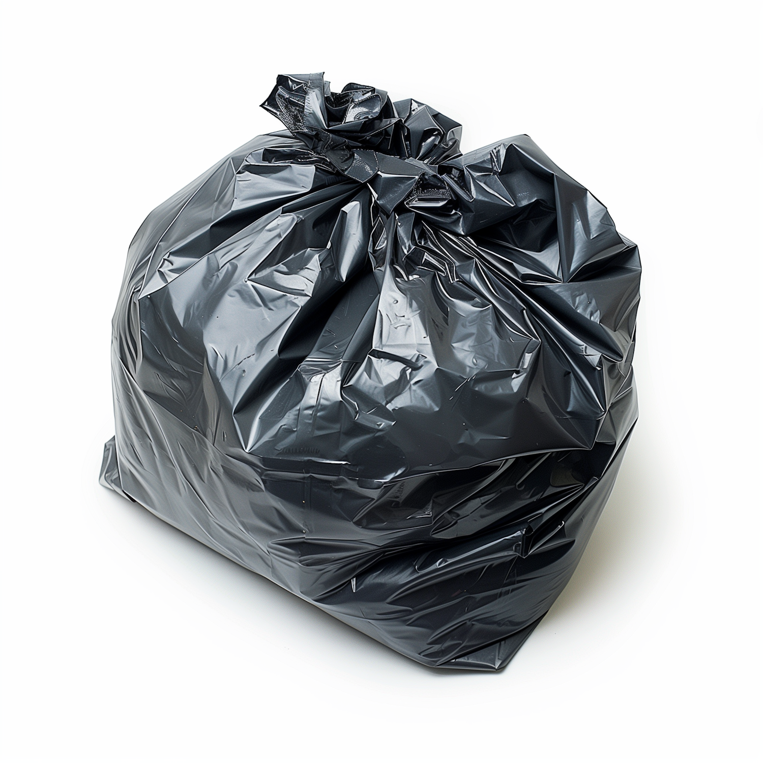 A shiny black garbage bag tied securely, sitting on a clean white background, showcasing its crinkled texture and rounded shape.